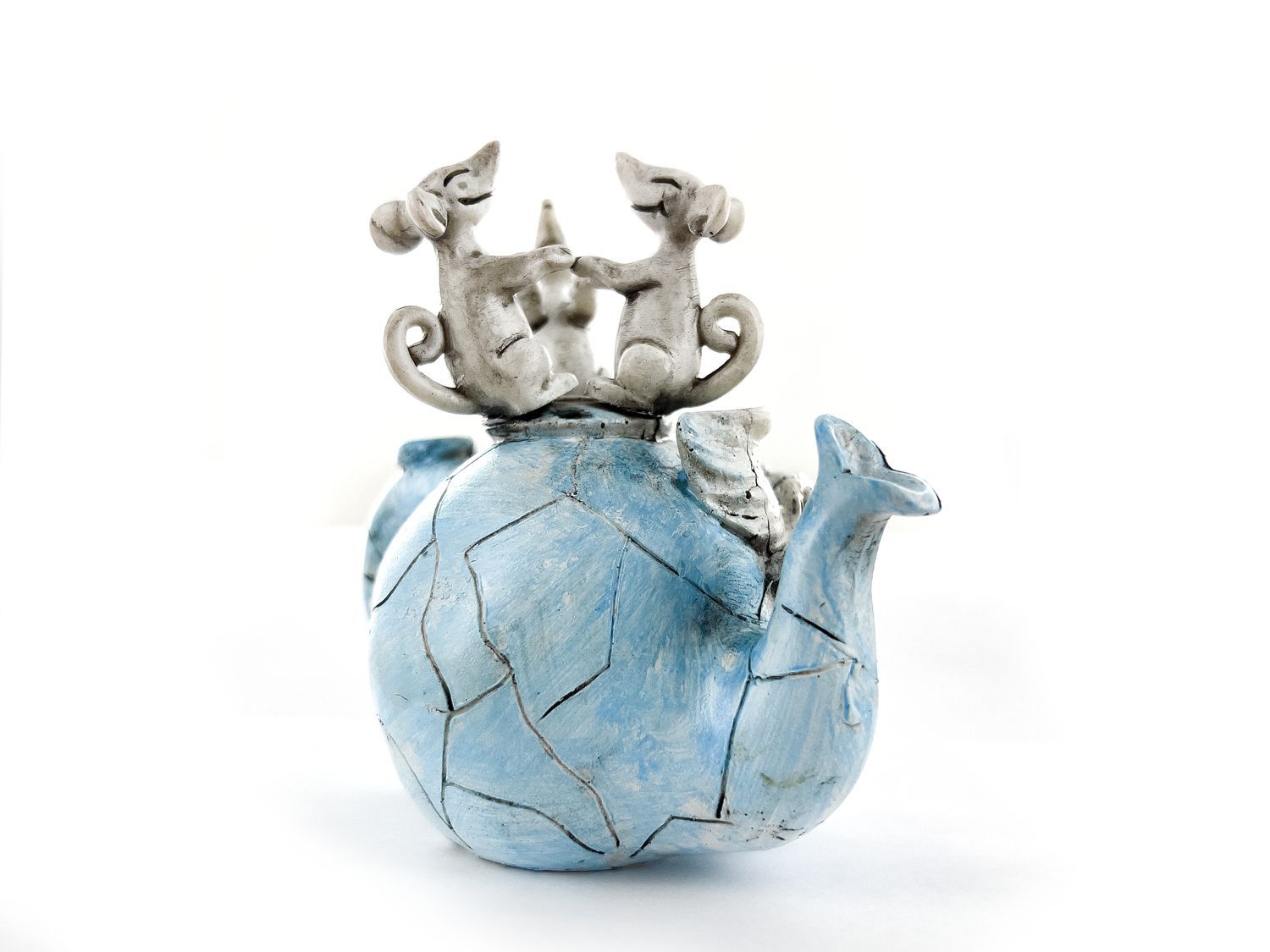 Статуэтка - чайник имеет форму симпатичного кота с детализированными чертами и хвостом, который служит в качестве ручкой. Он выполнен из полистоуна высокого качества, что обеспечивает прочность и долговечность изделия.