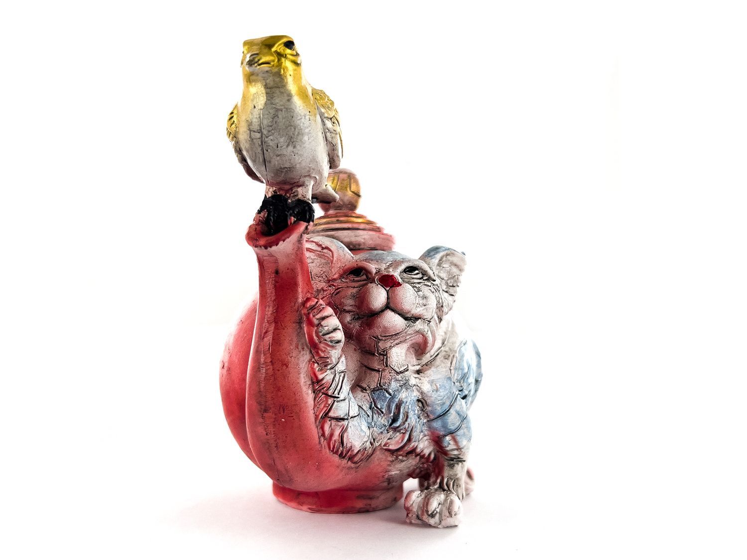 Статуэтка в виде чайника имеет форму симпатичного кота с детализированными чертами и хвостом, который используется в качестве ручки. Он выполнен из полистоуна высокого качества, что обеспечивает прочность и долговечность изделия.