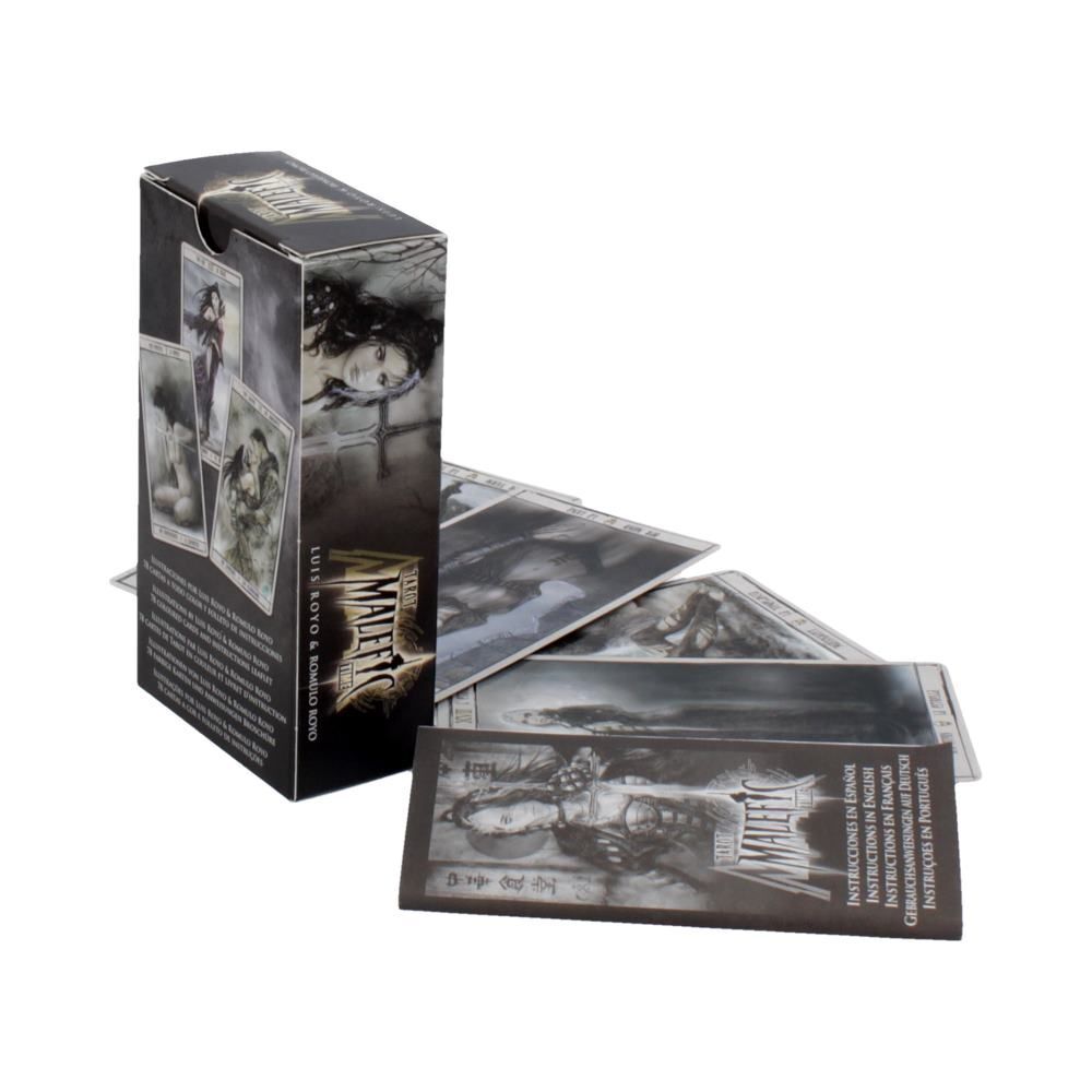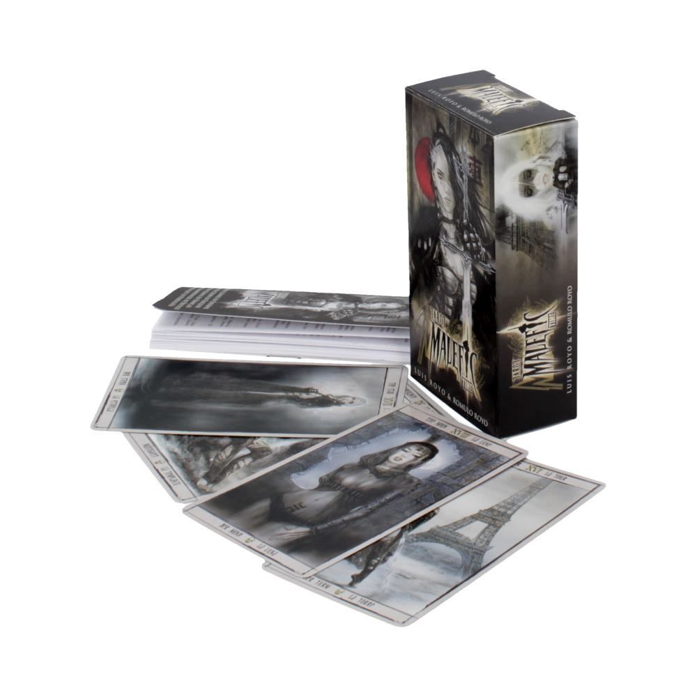 Стандартная колода Таро, проиллюстрированная Луисом и Ромуло Ройо. Колода издана Фурнье. Карты имеют размеры 2 и 6/16 дюймов на 4 и 6/16 дюймов. Фурнье производит колоды с гладким, приятным картоном и качественной отделкой. Время Таро Малефик не является исключением. Карты немного меньше, чем у многих других Таро массового рынка, что делает эту колоду хорошим выбором для людей, которые хотят, чтобы карты были более удобными для перетасовки. Он поставляется в стандартной коробке с небольшим многоязычным буклетом.Буклет, который идет с этой колодой, похож на другие буклеты, которые сопровождают колоды Фурнье. Он включает в себя базовое введение, описывающее несколько мифов о происхождении и теории о Таро, ключевые слова для каждой карты в колоде и инструкции по чтению карт. В разделе «Английский» есть опечатки и некоторые ошибки копирования / вставки (имейте в виду, что Fournier - испанский издатель), и инструкции по использованию карт могут быть немного сложными, если вы еще не знакомы с чтением карт.