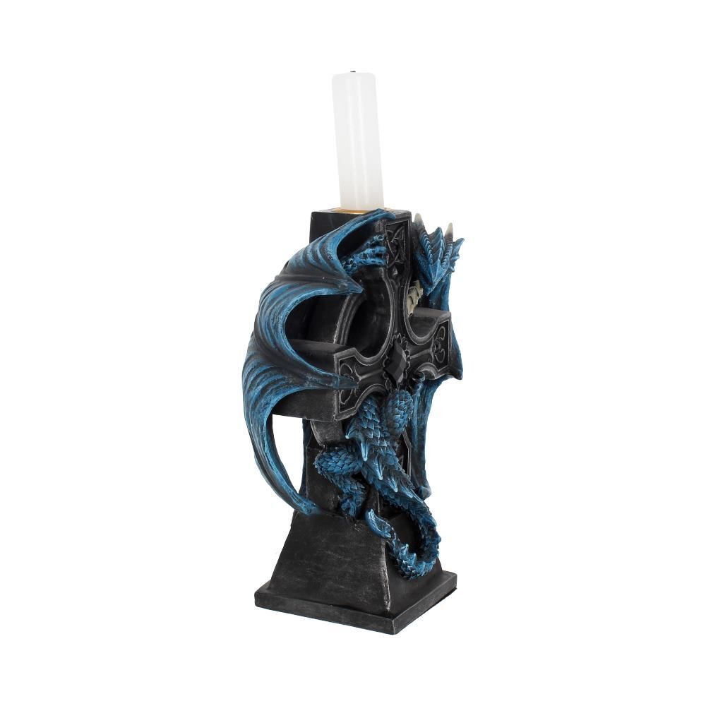Этот подсвечник с готическим драконом появился благодаря готическому воображению всемирно известной художницы альтернативного фэнтези Анны Стоукс. Этот черный кельтский крест с кельтскими узлами и замысловатыми узорами, инкрустированными черными драгоценными камнями, - идеальное место для отдыха нашего огненного спутника. Прижавшись к спине креста, синий дракон с поднятыми крыльями и головой настороженно следит за любыми злоумышленниками или потенциальными ворами. В верхней части креста есть небольшое пространство для установки свечи. Отлитый из тончайшей смолы и тщательно раскрашенный вручную, этот предмет является фантастическим способом осветить свой путь в готических фантазиях. 18 см.
