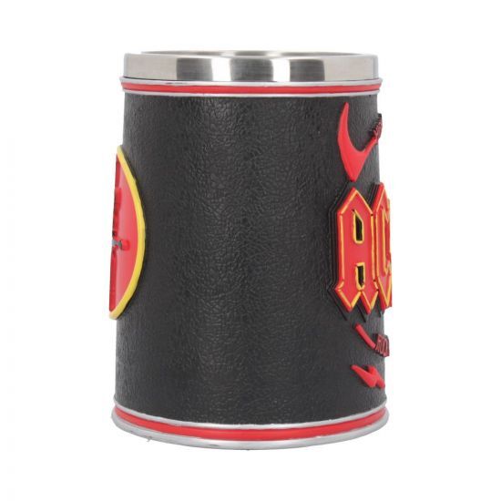 "Официально лицензированная кружка ACDC Tankard. В окружении слов ""высоковольтный рок-н-ролл"", расположенных между парой красных дьявольских рогов, прямо в центре находится логотип ACDC в виде молнии. На обратной стороне танкарда на красном фоне красуется знаковый силуэт Ангуса Янга, очерченный желтым цветом. Эти яркие цвета зеркально отражаются на ручке, которая напоминает фирменную молнию группы. Отлитый из высококачественной смолы и расписанный вручную, Tankard поставляется со съемной вставкой из нержавеющей стали объемом 600 мл (1 пинта). Высота: 14 см. Поставляется в полноцветной подарочной коробке ACDC."