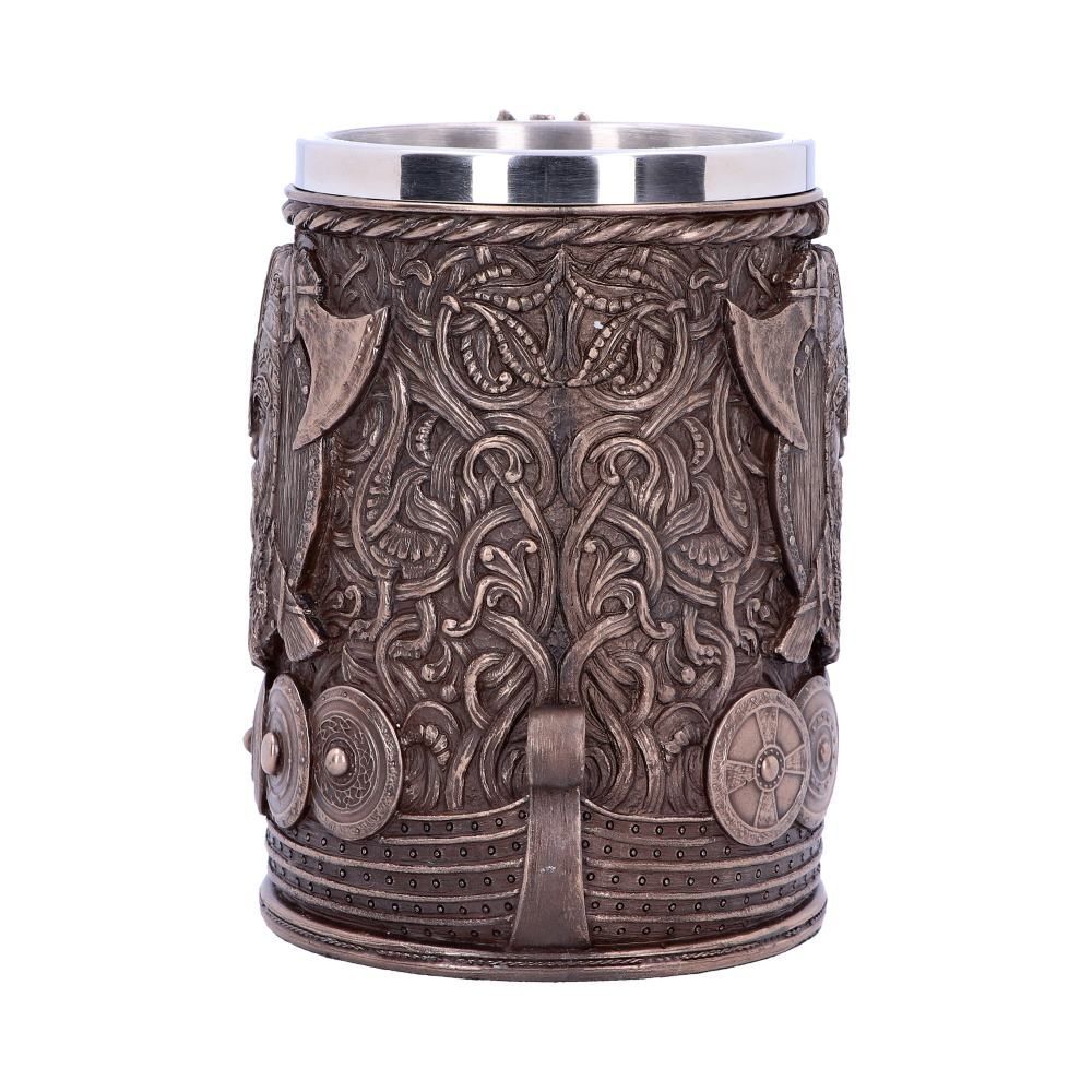 Сражайтесь за Валгаллу с бронзовым драккаром, созданным компанией Nemesis Now! Корпус этой кружки украшен замысловатой резьбой с великих кораблей викингов древности. На боковой стороне кружки изображено лицо воина в большом шлеме с двумя грозными топорами, скрещенными за спиной. Ниже портрета изображен квартет щитов викингов, опирающихся на корпус корабля. Ручка сделана из носовой части большого боевого корабля викингов и украшена резной головой дракона, которая образует верхнюю часть ручки. Отлитый из высококачественной бронзы, этот танкард поставляется со съемной вставкой из нержавеющей стали для удобства чистки.