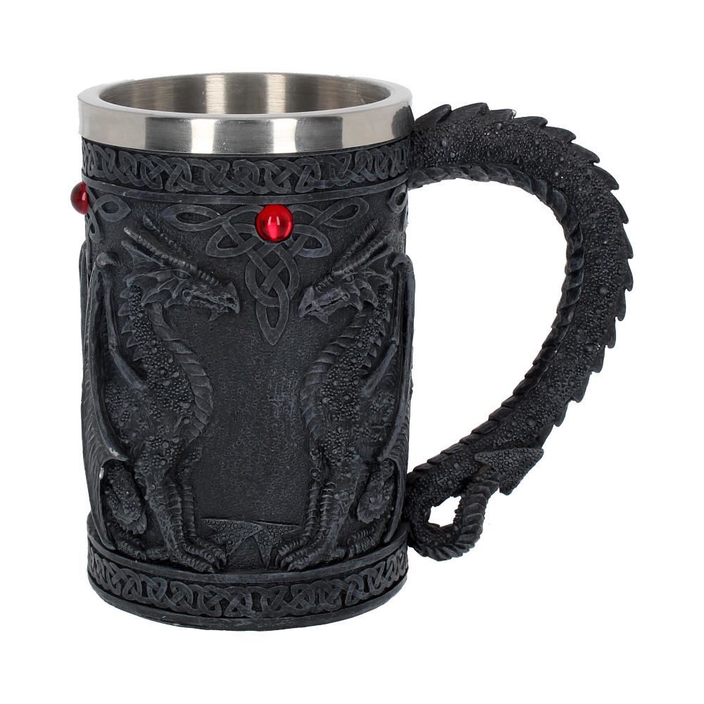 Выпейте с драконами из этого восхитительный готического танкарда, созданного компанией Nemesis Now. Черный, как резной обсидиан, корпус кружки изображает драконов в профиль, сидящих и смотрящих друг на друга. Между их немигающими взглядами - красный драгоценный камень в вершине узора кельтского узла. Ручка бокала представляет собой хвост черного дракона. Отлитый из тончайшей смолы, а затем искусно расписанный вручную, этот танкард поставляется со съемной вставкой из нержавеющей стали для удобства чистки.