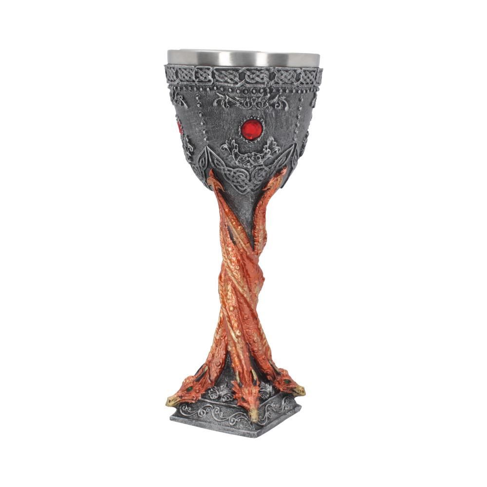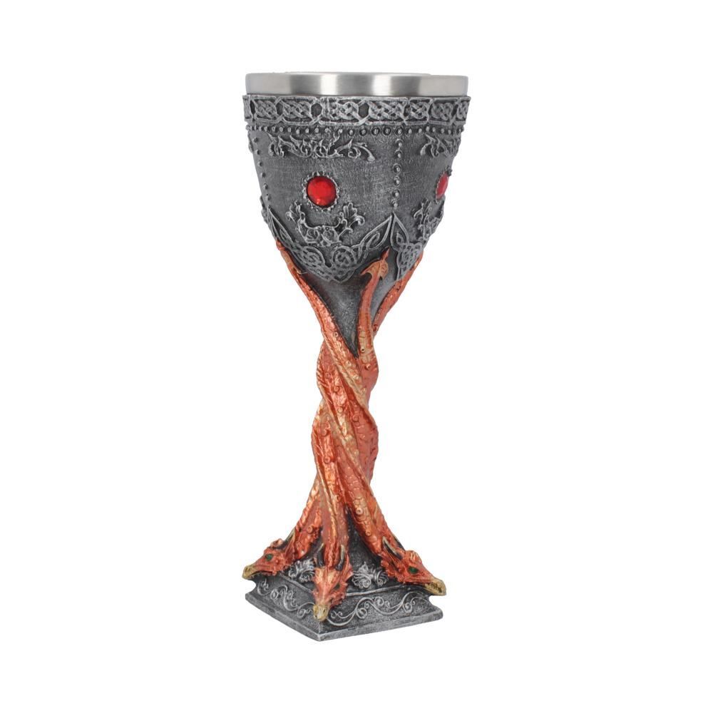 Этот кубок был создан талантливыми дизайнерами бренда Nemesis Now. Отлитый из тончайшего полистоуна, а затем тщательно расписанный вручную, этот кубок поставляется со съемной вставкой из нержавеющей стали для удобства очистки. Предназначен для использования по прямому назначению, а так же в декоративных целях. Мыть только вручную. Объем бокала - 200 мл. Этот готический кубок идеально подходит для любого поклонника фэнтези. Основное внимание уделяется ножке, на которой расположены извивающиеся тела четырех янтарных драконов. Их головы лежат на каждом углу квадратного основания, которое украшено замысловатыми узорами из виноградных лоз. Несмотря на относительно простой дизайн, чаша украшена кельтскими узорами и четырьмя красными драгоценными камнями рубинового цвета. 24 см.