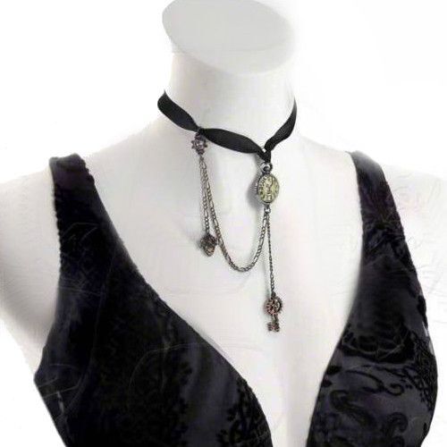 Идеальные миниатюрные 13-часовые часы-чокер с необходимыми аксессуарами викторианской эпохи и надписью "Hora Morti", которые украсят изящную шею утонченной стимпанк-хозяйки.