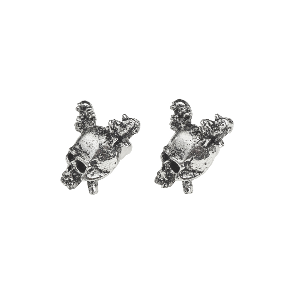 Пара 3D скульптурных, из английского пьютера, сережек на базе черепа Pushead с изображениями военных шипов, из тура "Damage Inc. Вес и размеры: H: 32 мм (1,26") W: 14 мм (0,55") D: 16 мм (0,63") Вес: 5 г (0,18 унции).
