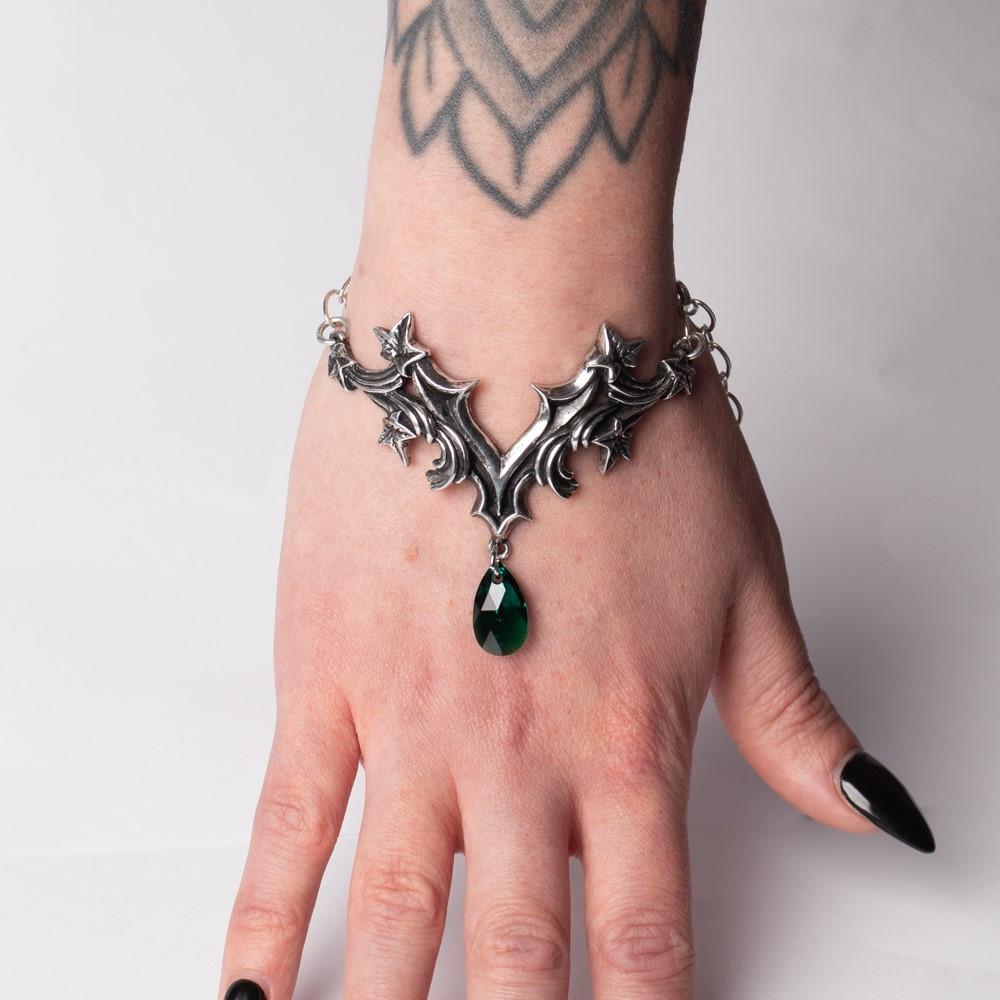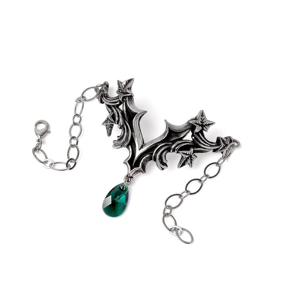 Браслет "Церковный двор" — это не просто украшение, а настоящее произведение искусства, созданное с любовью в Alchemy. Он украшен нежными листьями плюща, барочными вихрями и великолепным зеленым кристаллом австрийской огранки, отражая суть печали и спокойствия. Этот браслет станет идеальным дополнением как для вечернего наряда, так и для повседневной элегантности.