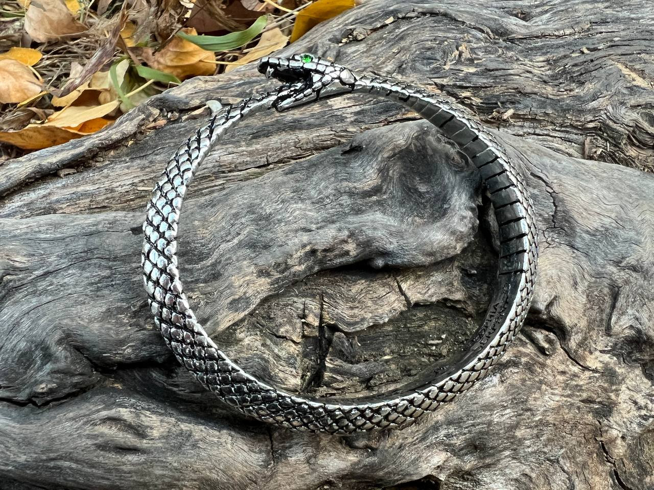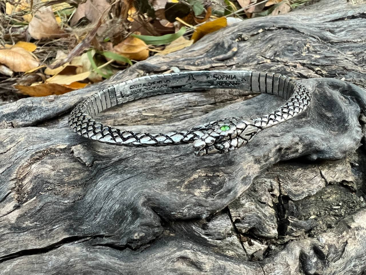 Браслет изображает Уроборос — змею, поедающую свой хвост, что символизирует циклы жизни, смерть и возрождение. Наличие зеленых австрийских кристаллов в глазах змеи добавляет изящество и яркость, делая изделие более привлекательным и уникальным.