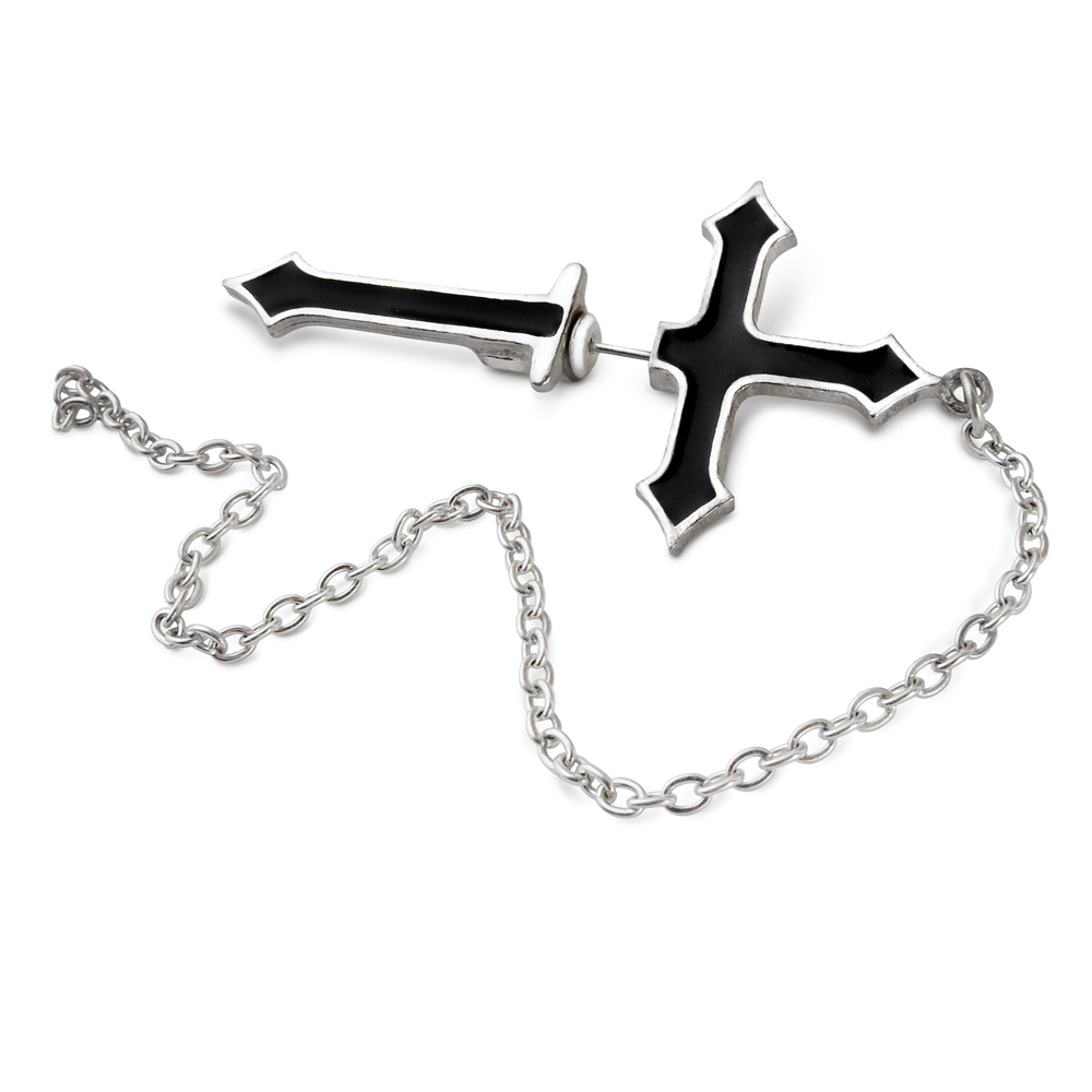 Название происходит от латинского слова «пронзенный»; вас пронзает непреходящий символ жертвенности — черный эмалированный крест, пронзающий мочку уха, с предохранительной цепью и стержнем из хирургической стали. Захватывающая серёжка, которая наверняка привлечёт внимание. Пронзительная серьга из черного эмалированного английского пьютера с цепью. Вес и размеры: H: 56 мм (2,20") W: 32 мм (1,26") D: 7 мм (0,28") Вес 8 г (0,28 унции).