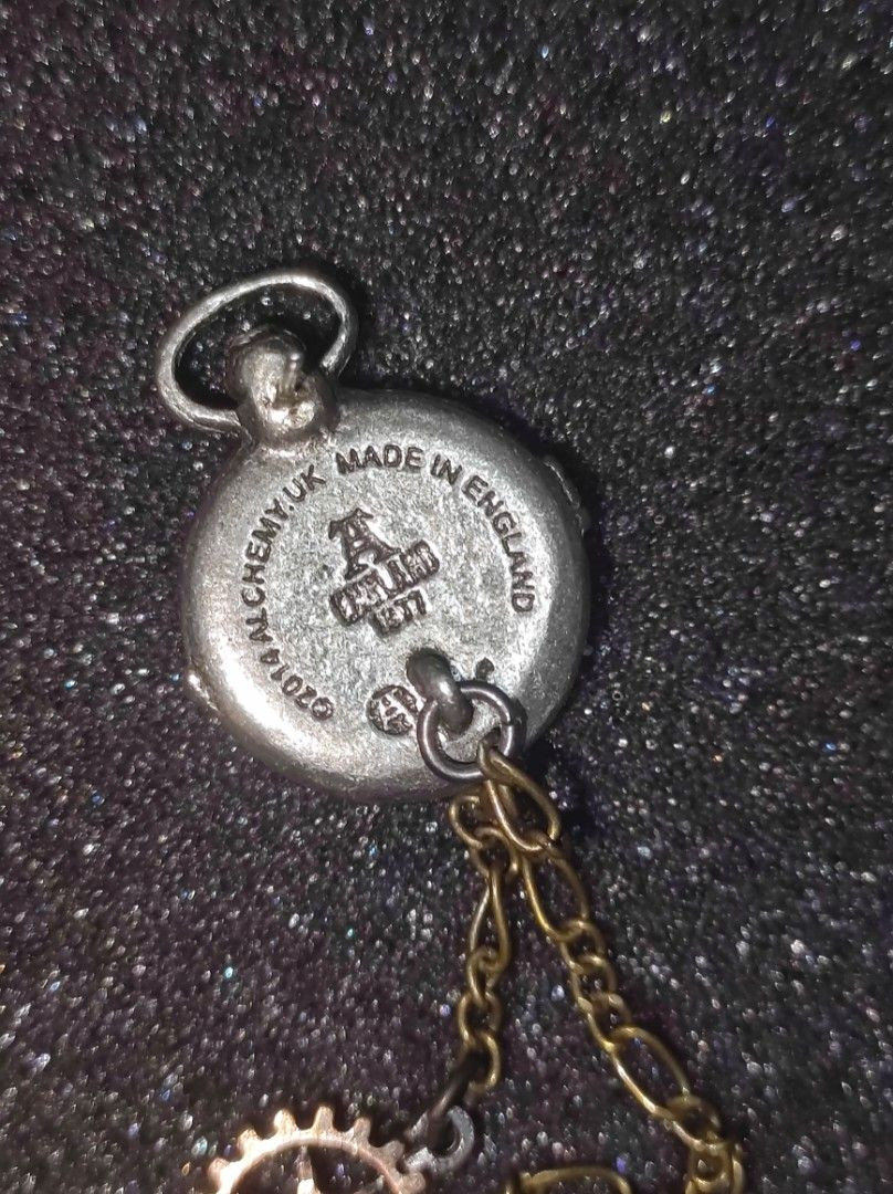 Идеальные миниатюрные 13-часовые часы-брелоки лунного времени и их аккомодации викторианской эпохи, на манжете латинская фраза гласит "Tempus Fugit, Tempus Moritur" - "Время летит, время умирает". Надпись "Hora Morti" - "Час смерти". Дядя Альберт знает, что до года осталось 13 лунных месяцев... Миниатюрная серьга в форме карманных часов из английского пьютера с застекленным циферблатом, прикованных к манжете, и висящих на тонкой цепочке украшены ключом и бронзовым брелоком в форме мини-щита. Вес и размеры: H: 145 мм (5,71 дюйма) W: 21 мм (0,83 дюйма) D: 16 мм (0,63 дюйма) Вес 16 г (0,56 унции).