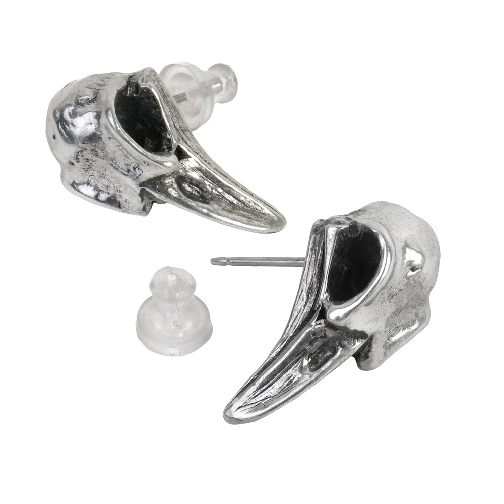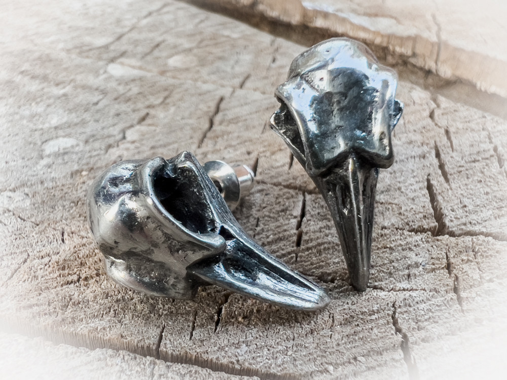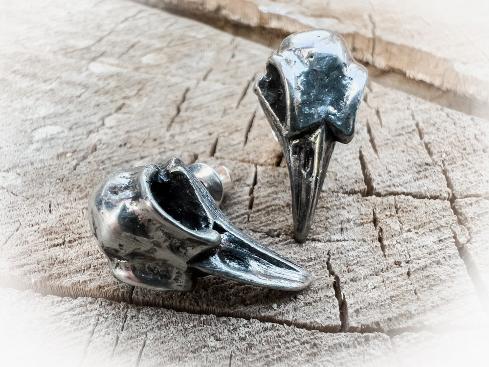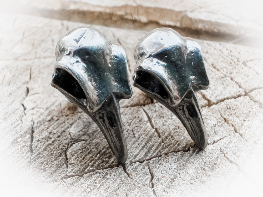 Скандинвский - "череп ворона"; великие черные птицы славятся своими пророческими способностями, являясь посланниками Одина и способные предсказывать смерть. Сговор воронов всегда привлечет внимание на хорошо заметном месте. Пара аутентичных миниатюрных черепов воронов в полированном английском пьютере,