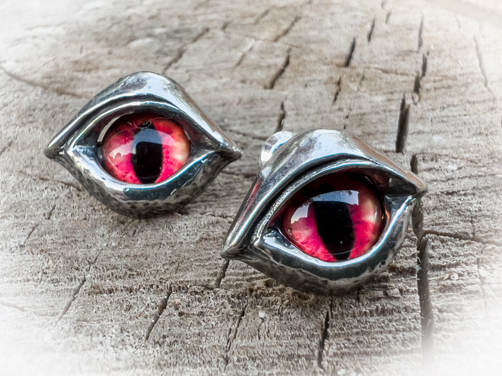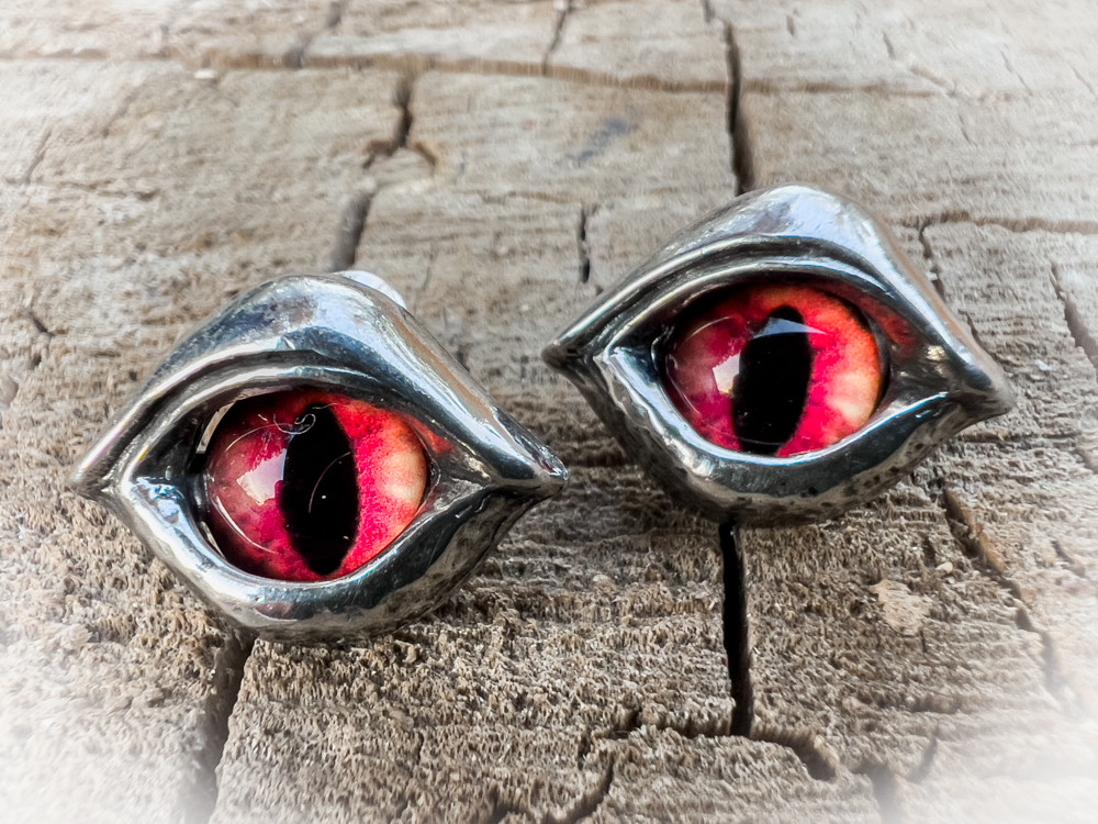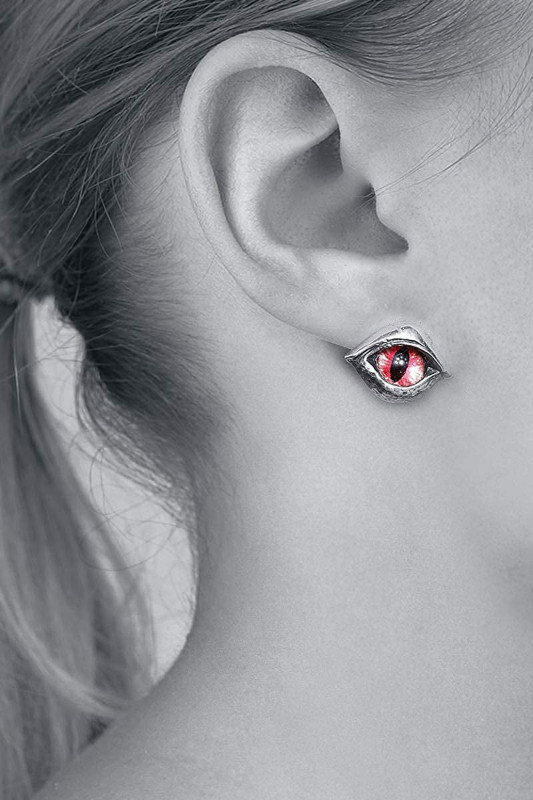 Дизайн сережек выполнен в форме глаз с красной и черной радужкой. Это создает эффект демонических глаз, которые смотрят прямо в душу.