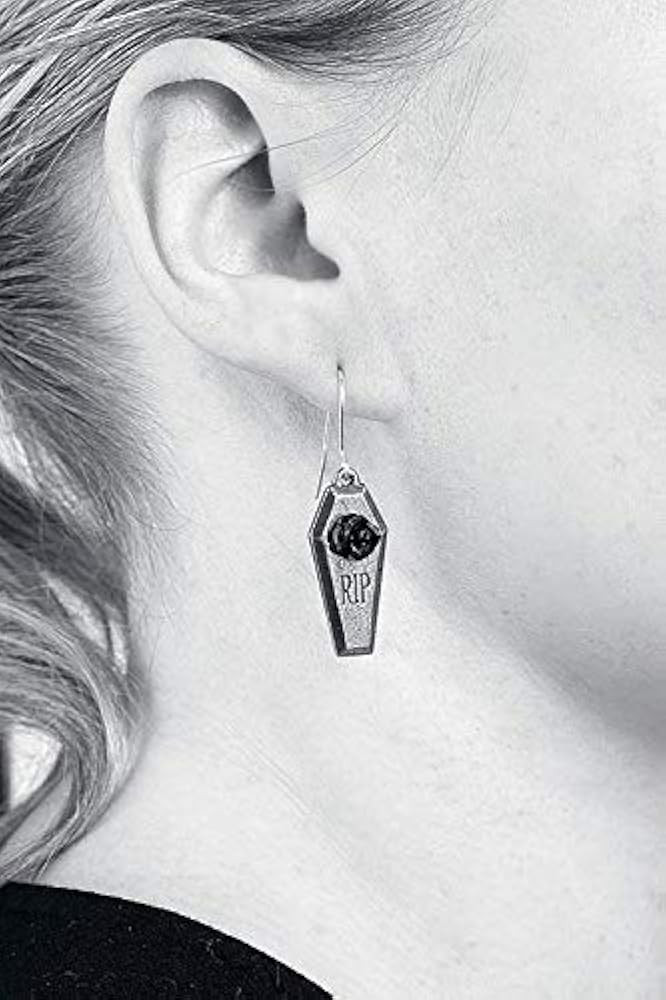 Темная и смертельная страсть по ту сторону жизни. Добавьте в свой образ готической эстетики. Пара сережек в виде крышки гроба с выгравированной надписью "RIP" и украшенной цветком розы. Вес и размеры: H: 28 мм (1,10") W: 12 мм (0,47") D: 8 мм (0,31") Вес: 11 г (0,39 унции).