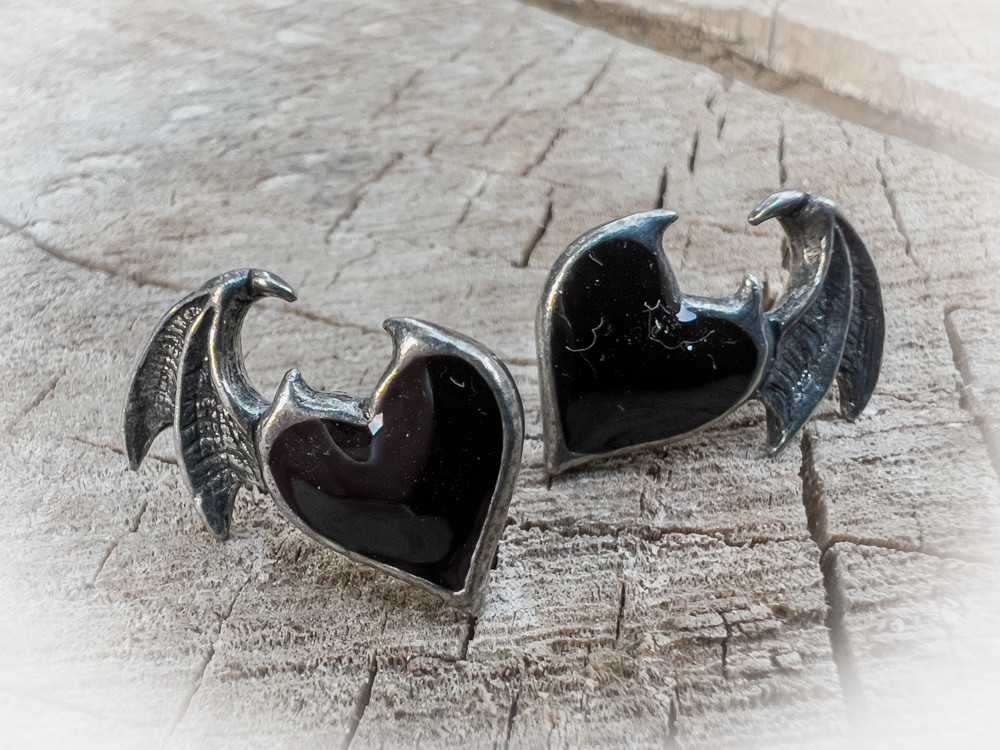 Черное сердце готической прелестницы-демоницы, заманивающей свою добычу в ночи магическим очарованием. Миниатюрная пара серёг-сердечек с крыльями летучей мыши. Вес и размеры: H: 20 мм (0,79 дюйма) W: 21 мм (0,83 дюйма) D: 15 мм (0,59 дюйма) Вес: 6 г (0,21 унция).