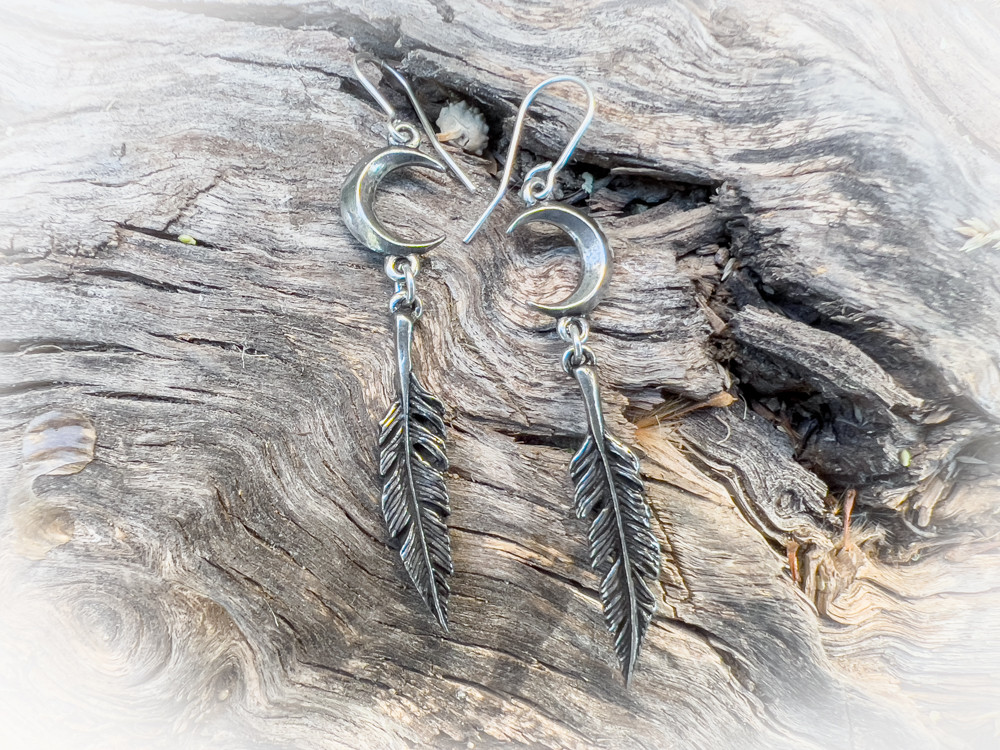 Дизайн серег включает в себя подвески в виде месяца/полумесяца, перьев и геометрических фигур. Тематика готики и символики придает украшению особый шарм и загадочность.