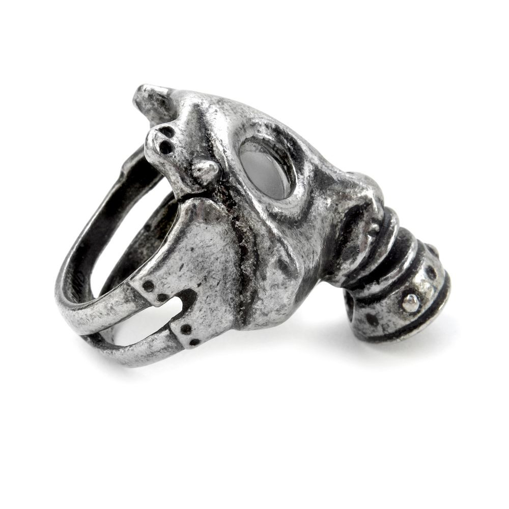 Кольцо Asphyxia. Аутентичная копия немецкого противогаза времен Первой мировой войны: со стеклянными линзами. Кольцо из английского пьютера. Изделия в индивидуальной фирменной упаковке, включающей гарантию и инструкцию по уходу. Разработаны и изготовлены вручную в Англии из английского пьютера.