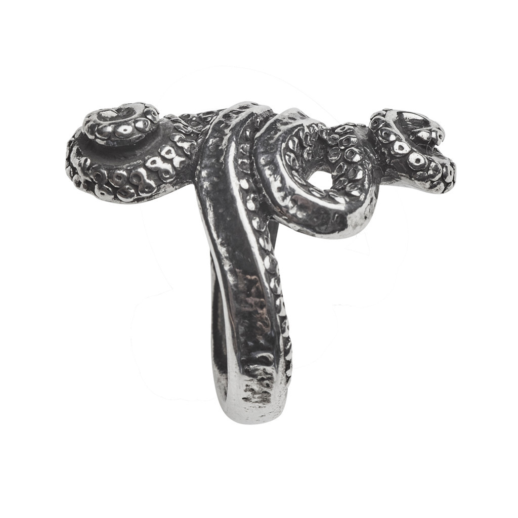 Вы пытаетесь избавиться от ощущения чудовищных, скользких щупалец, пытающихся вцепиться в вашу шею, как это не удавалось бесчисленному множеству людей в таинственных и трагических морских историях. Кольцо из полированного состаренного пьютера, стилизованное под щупальца гигантского кальмара, обхватывает палец.