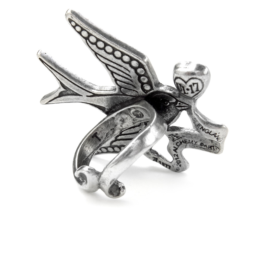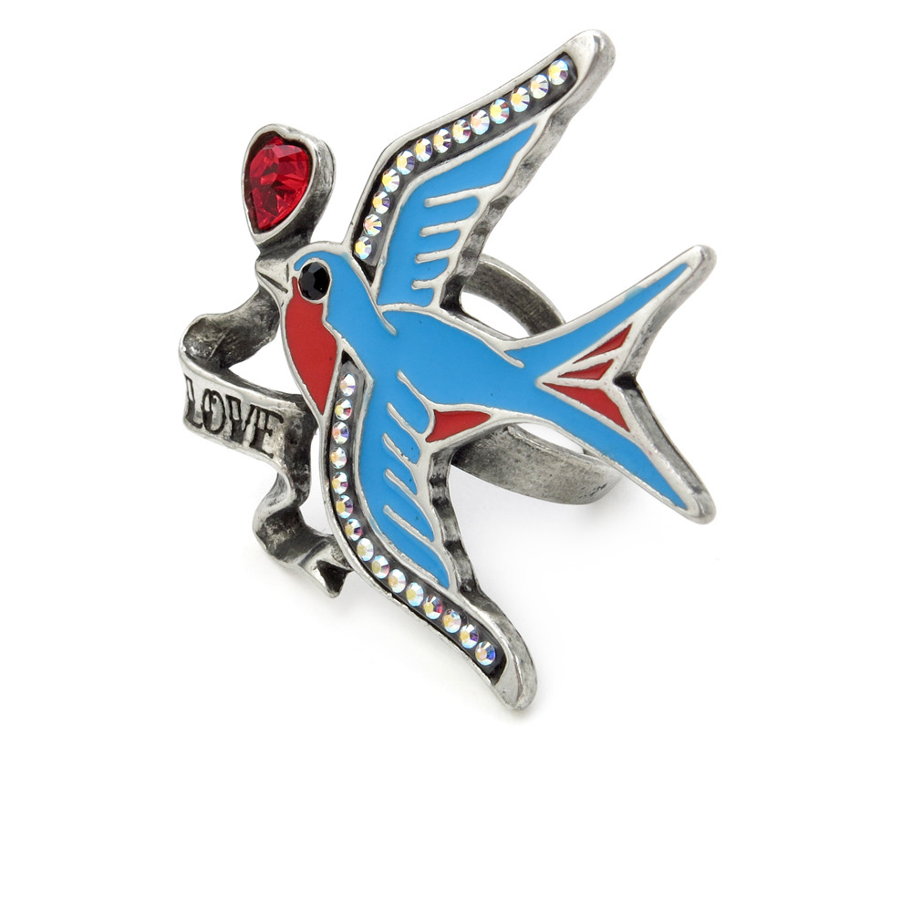 Большое двухцветное эмалированное кольцо «Ласточка» с сердцем из кристаллов Swarovski, хрустальными «нитками» и гравированным свитком «LOVE». Ширина 1,81 дюйма x высота 0,94 дюйма x глубина 1,81 дюйма Прибл.