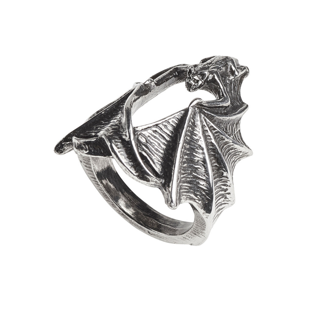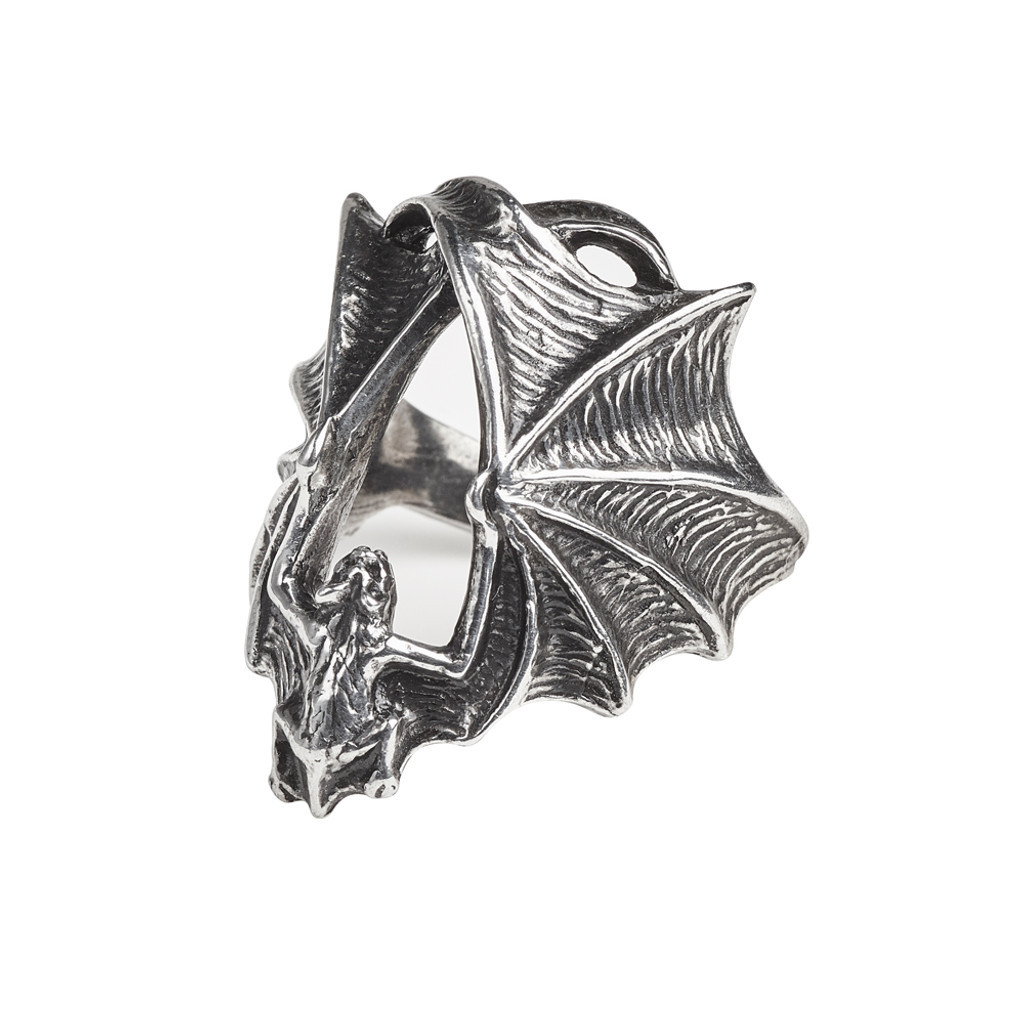 Под покровом ночи летучая мышь в абсолютной тишине приближается к намеченной добыче, чтобы удовлетворить свою жажду и полакомиться жертвой. Крупное античное литое кольцо в виде крадущейся летучей мыши с огромными распростертыми крыльями, охватывающими палец.