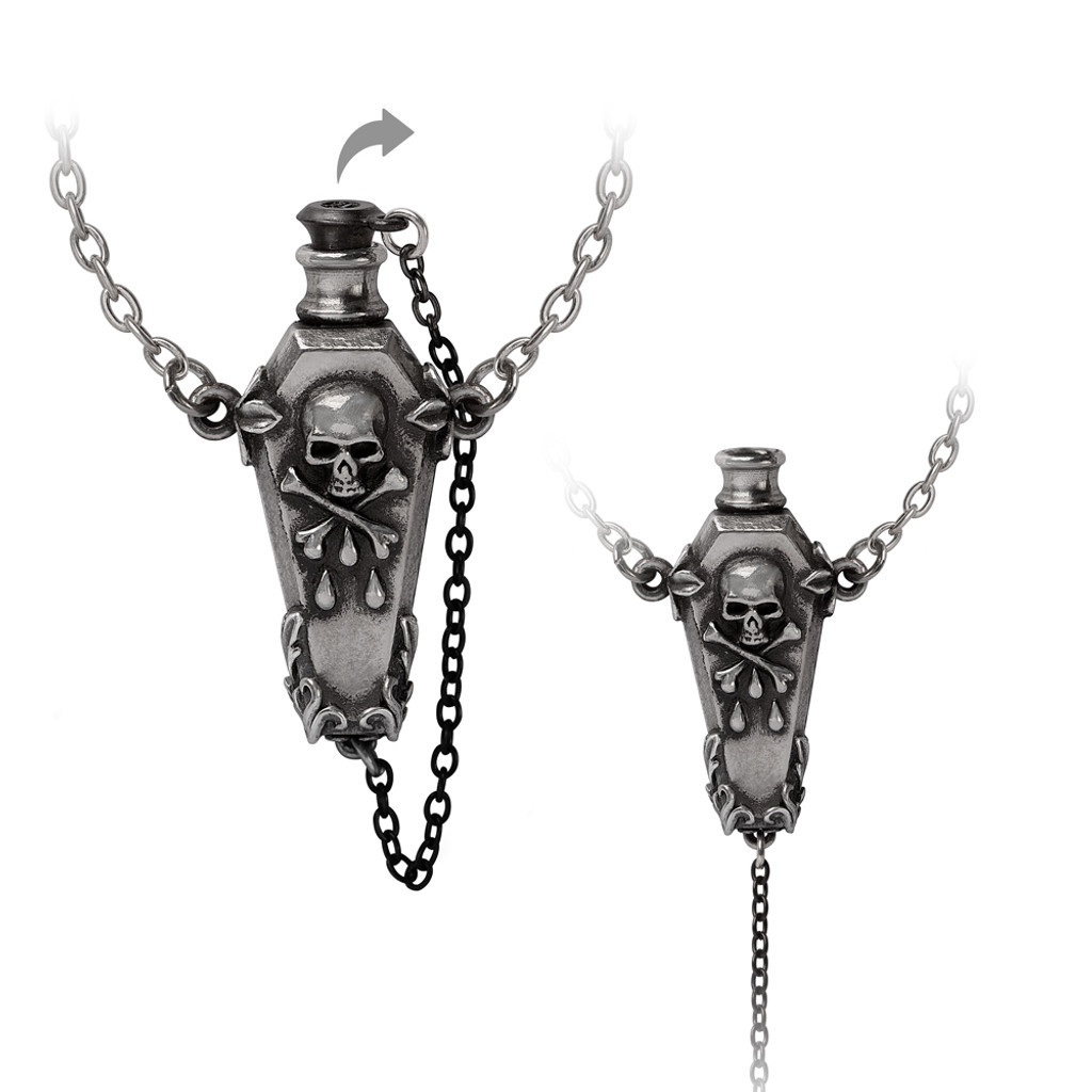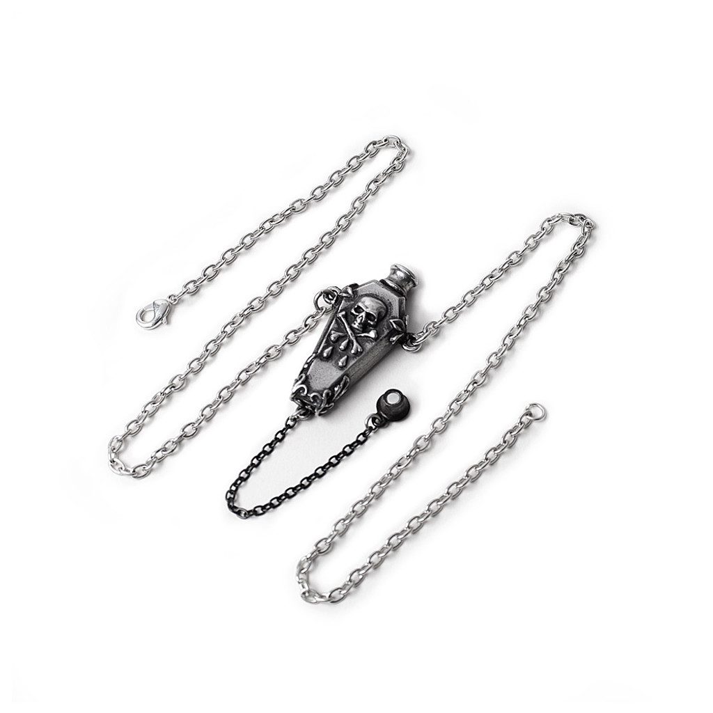 Старинная бутылка для яда в форме гроба, украшенная черепом и скрещенными костями. В комплекте с контрастной черной съемной крышкой. *Обратите внимание: это не настоящая бутылка, у нее полая задняя часть.