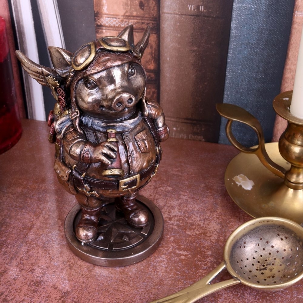 Может быть, свиньи умеют летать! Этот очаровательный поросенок от альтернативного бренда Nemesis Now доказывает, что стереотипы ошибочны! В комплекте с очками авиатора, комбинезоном и механическими крыльями он готов к бою! Отлитый из тончайшего полистоуна, а затем отделанный бронзой и раскрашенный вручную, он станет прекрасным дополнением к любой коллекции в стиле стимпанк. 13 см.