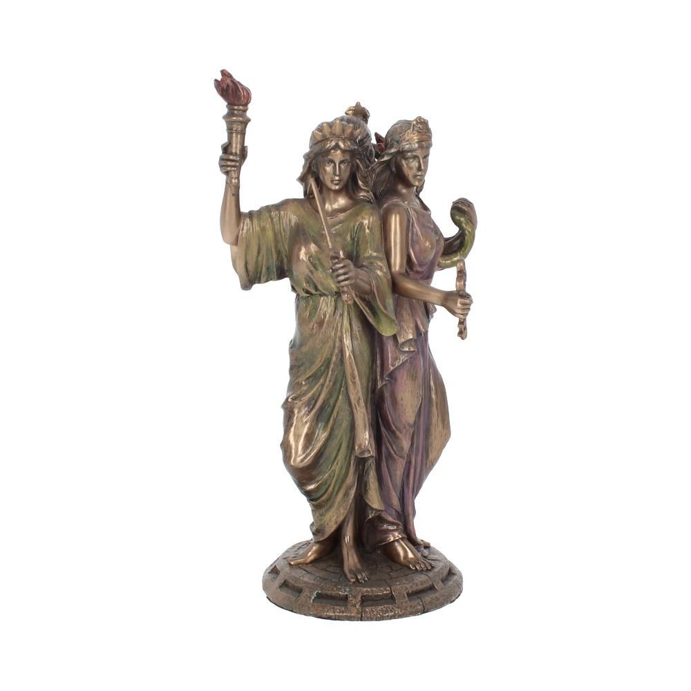 Отлитая из тончайшего полистоуна и покрытая бронзой, эта мистическая богиня представлена в коллекции сувенирной продукции альтернативного бренда Nemesis Now. Геката - богиня в древнегреческой религии и мифологии, чаще всего изображаемая с парой факелов или ключом, а в более поздние периоды изображаемая в тройной форме, как на этой прекрасной фигурке. Она ассоциировалась с перекрестками, входами, светом, магией, колдовством, знанием трав и ядовитых растений, призраками, некромантией и колдовством. Позвольте Гекате осветить ваш путь сегодня. 21 см.