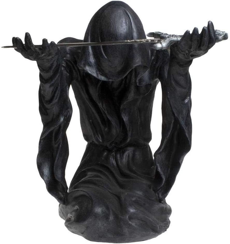 Этот темный Жнец покоится, преклонив колени, склонив голову, покрытую капюшоном, с поднятыми вверх в знак покорности руками. В его робкой руке - небольшой клинок, которым можно вскрыть самую ценную почту. Его черный плащ драпируется вниз, скрывая лицо, придавая этой фигурке зловещую ауру. Отлитая из тончайшего полистоуна и раскрашенная вручную, эта фигурка станет желанным дополнением любого готического дома или офиса. 20 см.