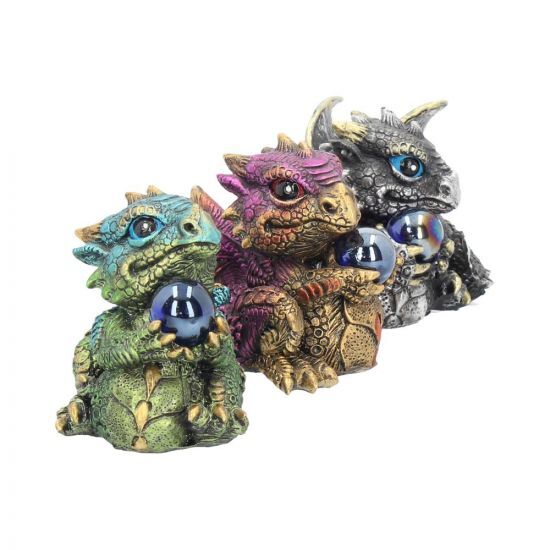 Отлитые из тончайшего полистоуна и с любовью расписанные вручную, эти драконы станут прекрасным дополнением к дому любого любителя фантастики. Каждый из них держит большую сферу. Эти драконы представлены в 3 разных цветах, их можно выставлять вместе или разделить на отдельные подарки. Три фигурки в комплекте. 7 см.