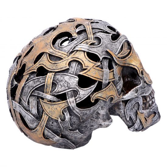Покрытый серебристым и медным оттенком, этот череп выглядит так, как будто в него вмонтированы традиционные племенные узоры. Глазные впадины и носовое отверстие затемнены, что придает ему угрожающий вид, а зубы зеркально отражают серебро, которое можно увидеть по всему черепу. Отлитый из тончайшего полистоуна и тщательно раскрашенный вручную, этот череп является неотъемлемой частью любой коллекции в стиле готики, фэнтези или стимпанка. 14 см.