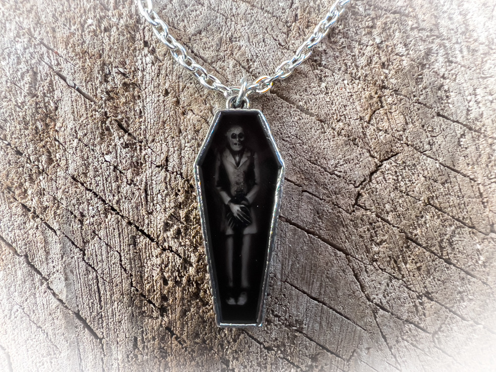 Подвеска выполнена в виде застекленного гроба с изображением мрачной фигуры Носферату. Это незабываемый призрак ужасного графа Мурнау Орлока, который всем своим видом передает атмосферу готического ужаса.