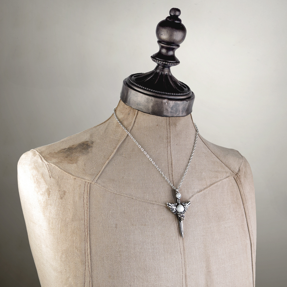 Подвеска выполнена в виде головы волка и кинжала с двумя камнями, имитирующими луну. Это придает украшению уникальный и запоминающийся вид.