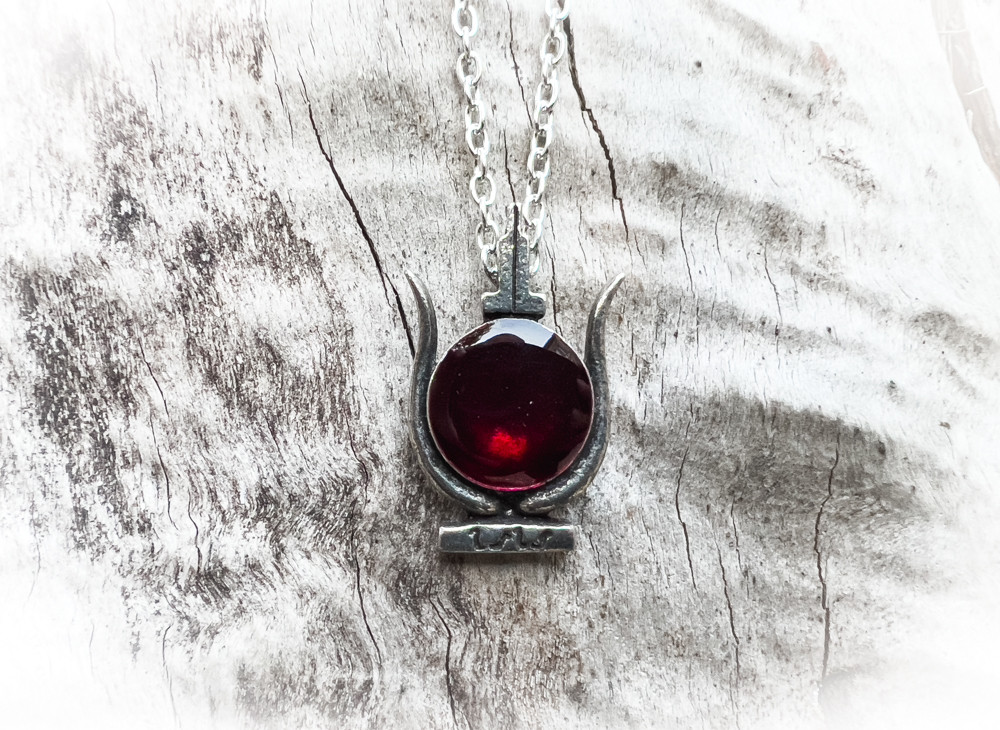 Кулон ручной работы из английского пьютера и красной эмали изображает солнечный диск, покоящийся между рогами Хатор или парой коровьих рогов. Под красным эмалированным Солнцем выгравировано имя великой египетской богини Исиды. Подвеска Культ Асет поставляется на цепочке. Жена Осириса и мать бога солнца Гора, богиня Исида была одним из самых популярных и могущественных египетских божеств. Исида была могущественной целительницей, и считалось, что она и ее муж Осирис принесли цивилизацию древним египтянам. Иногда Исида изображается с солнечным диском на голове, поддерживаемым парой коровьих рогов. В древние времена этот символ часто использовался против злого глаза. Этот кулон изготовлен вручную в Англии из английского пьютера высочайшего качества - это сплав, не содержащий свинца и цинка, он намного сложнее в обработке, чем низкосортные сплавы. Поскольку эти кулоны изготавливаются вручную, каждый из них уникален, и между отдельными экземплярами могут быть незначительные различия. Идеи и дизайн изделия разработаны художниками бренда The Alchemy Gothic и защищены авторским правом. Вес и размеры (приблизительно): H: 32 мм (1,26 дюйма) W: 20 мм (0,79 дюйма) D: 7 мм (0,28 дюйма) Вес 11 г (0,39 унции)