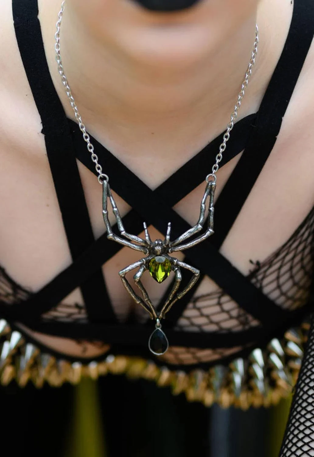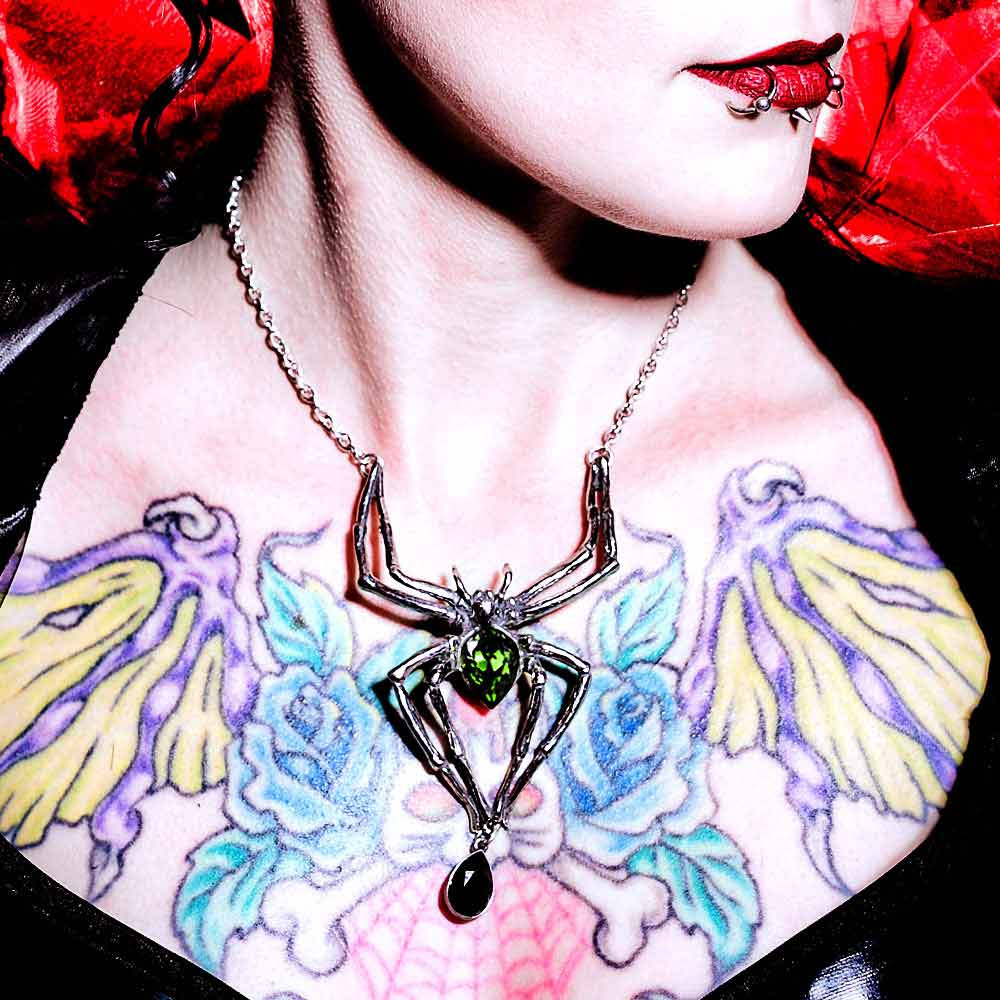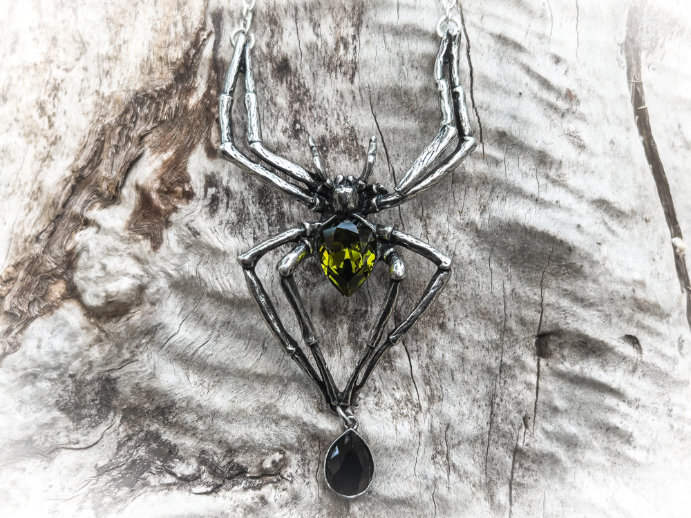 Смертоносный хищник, готовый погрузить свои неотразимые клыки в шею своего хозяина. Захватывающее ожерелье, которое добавит готической драму в любой наряд. Гигантское ожерелье-паук с зелеными и черными кристаллами. Подобное носил Элис Купер. Вес и размеры (приблизительно): H: 110 мм (4,33 дюйма) W: 68 мм (2,68 дюйма) D: 20 мм (0,79 дюйма) Вес 40 г (1,41 унция)