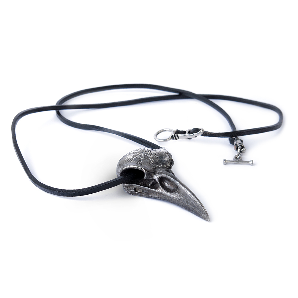 Подвеска в форме черепа ворона Одина, украшена изображением Шлем ужаса (Агисхьяльм). На черепе этого ворона выгравирован символ Исландии - "Агисхьяльм", или "Шлем ужаса", древние верили, что ее обладателю присуща могущественная сила и дар вселять страх в сердца врагов. Вороны-близнецы бога Одина ежедневно шпионили за человечеством, а затем прилетали к нему и рассказывали ему обо всех своих делах и подвигах. Вес и размеры (приблизительно): H: 64 мм (2,52 дюйма) W: 31 мм (1,22 дюйма) D: 17 мм (0,67 дюйма) Вес 48 г (1,69 унции)
