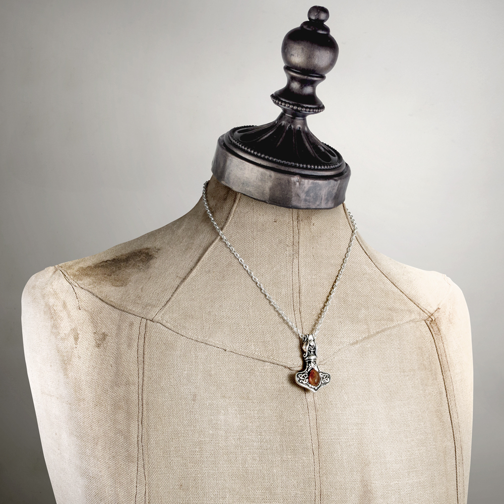 Подвеска в форме молота Тора украшена головой дракона и янтарем. Классический, вычурный и очень сложный языческий атрибут, подходящий для высокопоставленного лидера викингов. Голова дракона кусает цепь, а молот с кельтским узором украшен настоящим янтарем. Состаренный кулон молота Тора с головой дракона, украшенный традиционным кельтским узором и рунами. Молот закреплен на цепи и украшен уникальным, полупрозрачным, настоящим янтарем, позволяющим увидеть естественные недостатки на фоне света. На 21-дюймовой цепочке. Вес и размеры (приблизительно): H: 48 мм (1,89 дюйма) W: 30 мм (1,18 дюйма) D: 11 мм (0,43 дюйма) Вес 27 г (0,95 унции)
