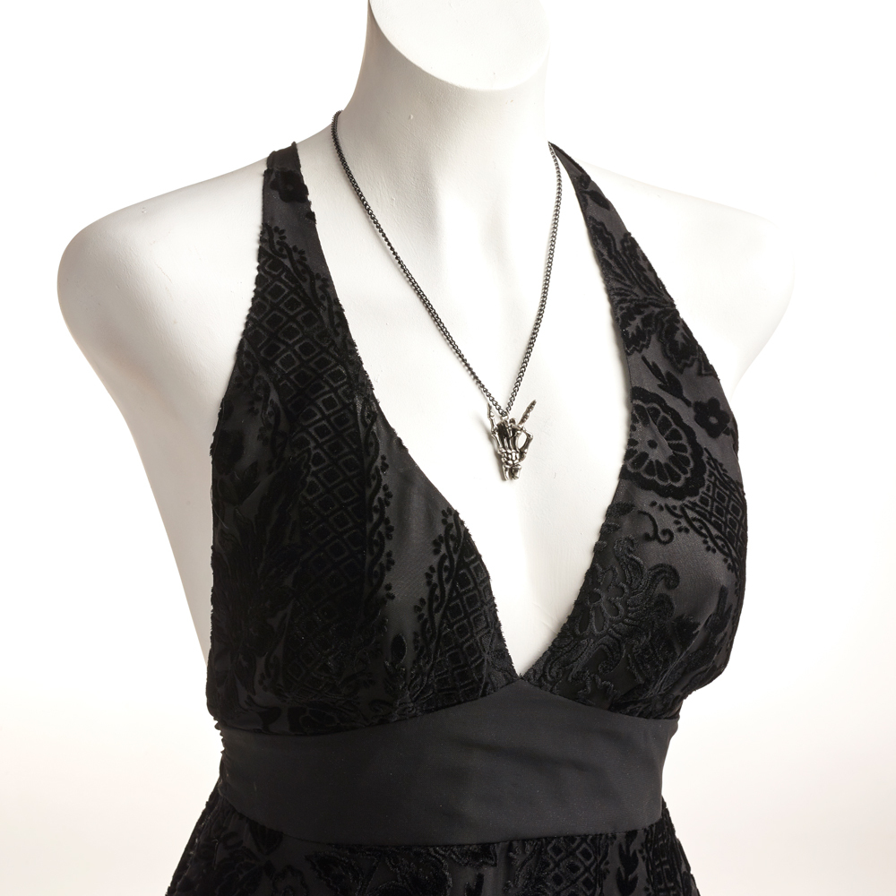 Альтернативная версия жеста "Знак рогов", или по-итальянски "mano cornuta". Популяризированный Ронни Джеймсом Дио из Black Sabbath, "Maloik" или "Malocchio" - "Дурной глаз" теперь является классическим жестом в рок- и металл- стилях. Кулон скелет кисти в жесте традиционного стиля, а так же рок-н-ролльного символа, на 21-дюймовой (53 см) цепочке. Вес и размеры (приблизительно): H: 41 мм (1,61 дюйма) W: 27 мм (1,06 дюйма) D: 13 мм (0,51 дюйма) Вес: 23 г (0,81 унции)