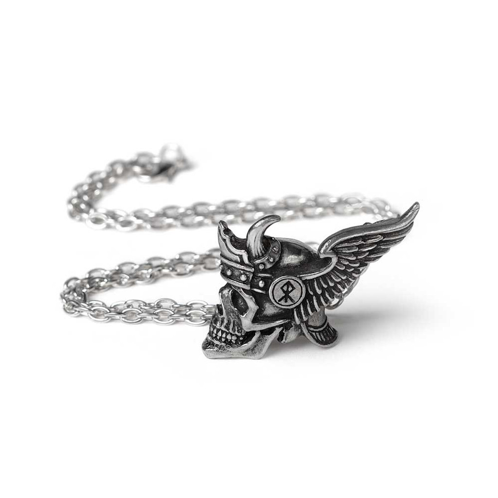 ПУТЕШЕСТВИЕ В ВАЛЬХАЛЛУ. Непоколебимая отвага воинов-эйнхериев гарантирует сопровождение валькирии в великий зал убитых. Ода викингу в вашем сердце! Символ силы и защиты. Подвеска из полированного пьютера в стиле викингов. Череп викинга в боковом профиле носит рогатый, крылатый шлем. Размер(приблизительно): На цепочке длиной 21 дюйм (53 см). Вес и размеры (приблизительно): H: 51 мм W: 35 мм D: 11 мм Вес: 25 г. Упаковано в фирменный пакет Alchemy, включая гарантию Alchemy и инструкции по уходу. Разработаны и изготовлены вручную в Англии из тонкого английского пьютера.