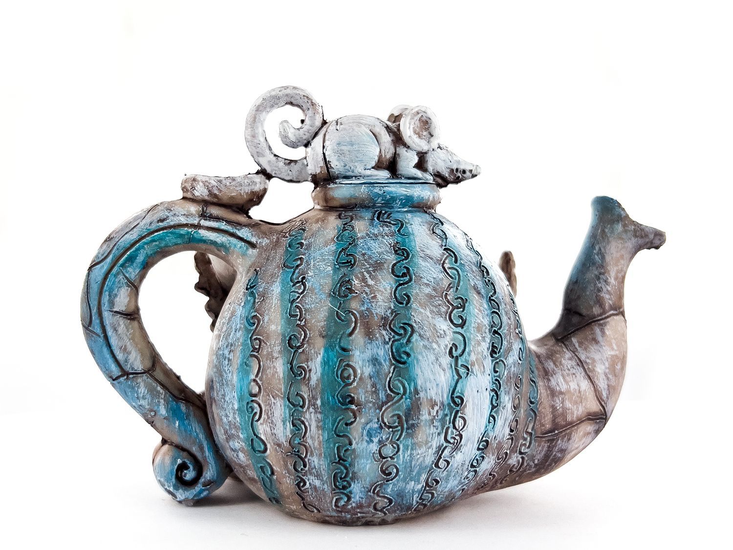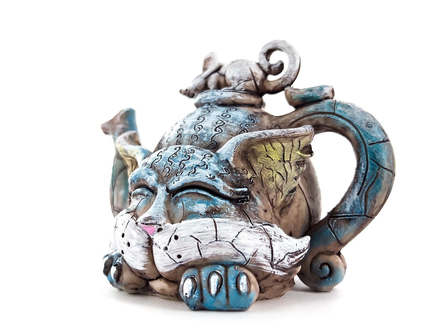 Статуэтка в виде чайника имеет форму симпатичного кота с детализированными чертами и хвостом, который используется в качестве ручки. Он выполнен из полистоуна высокого качества, что обеспечивает прочность и долговечность изделия.