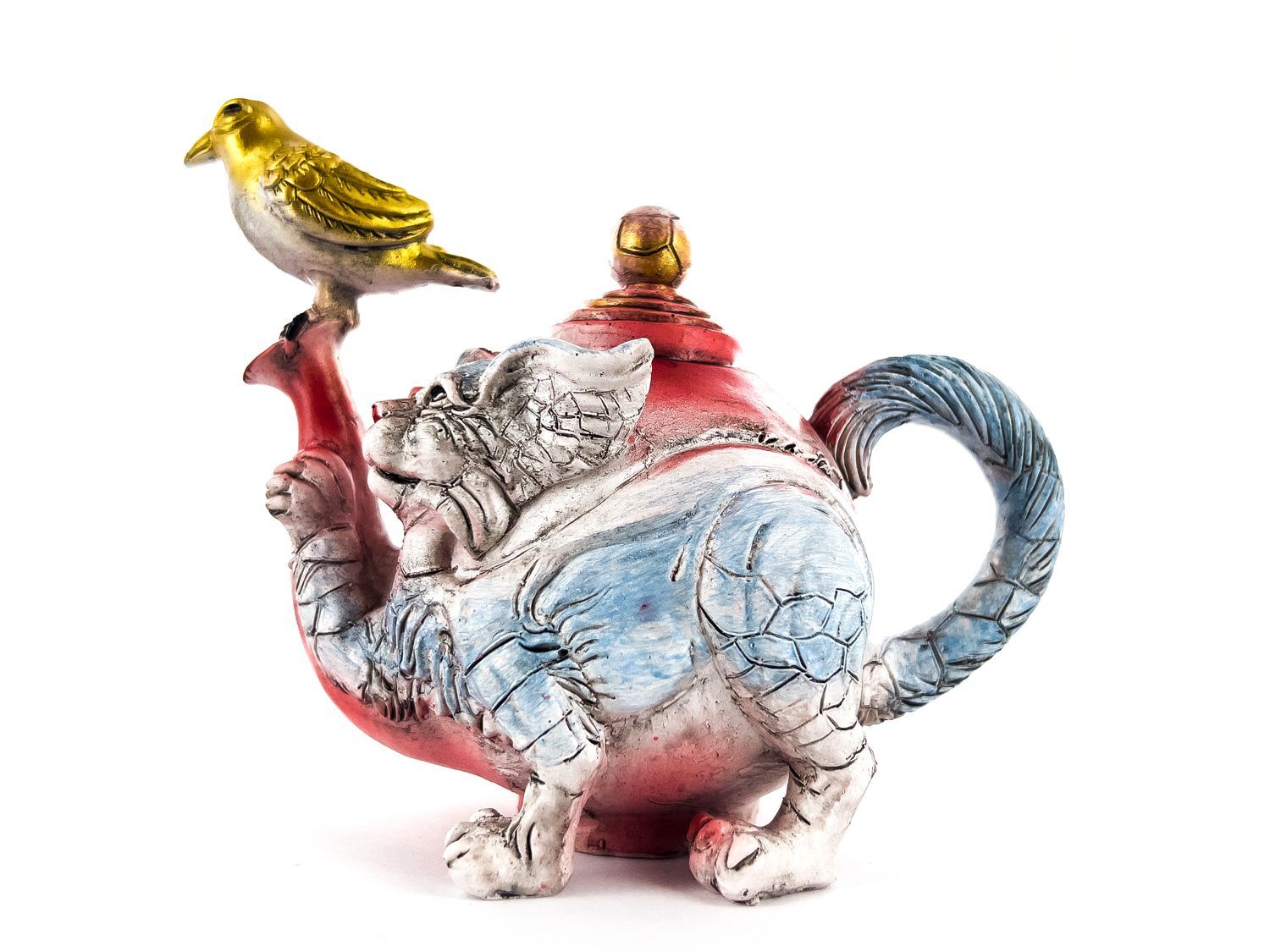 Статуэтка в виде чайника имеет форму симпатичного кота с детализированными чертами и хвостом, который используется в качестве ручки. Он выполнен из полистоуна высокого качества, что обеспечивает прочность и долговечность изделия.