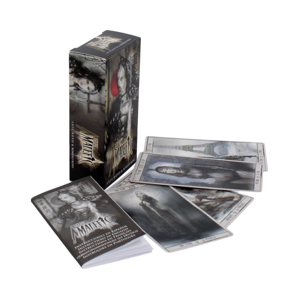 Стандартная колода Таро, проиллюстрированная Луисом и Ромуло Ройо. Колода издана Фурнье. Карты имеют размеры 2 и 6/16 дюймов на 4 и 6/16 дюймов. Фурнье производит колоды с гладким, приятным картоном и качественной отделкой. Время Таро Малефик не является исключением. Карты немного меньше, чем у многих других Таро массового рынка, что делает эту колоду хорошим выбором для людей, которые хотят, чтобы карты были более удобными для перетасовки. Он поставляется в стандартной коробке с небольшим многоязычным буклетом.Буклет, который идет с этой колодой, похож на другие буклеты, которые сопровождают колоды Фурнье. Он включает в себя базовое введение, описывающее несколько мифов о происхождении и теории о Таро, ключевые слова для каждой карты в колоде и инструкции по чтению карт. В разделе «Английский» есть опечатки и некоторые ошибки копирования / вставки (имейте в виду, что Fournier - испанский издатель), и инструкции по использованию карт могут быть немного сложными, если вы еще не знакомы с чтением карт.