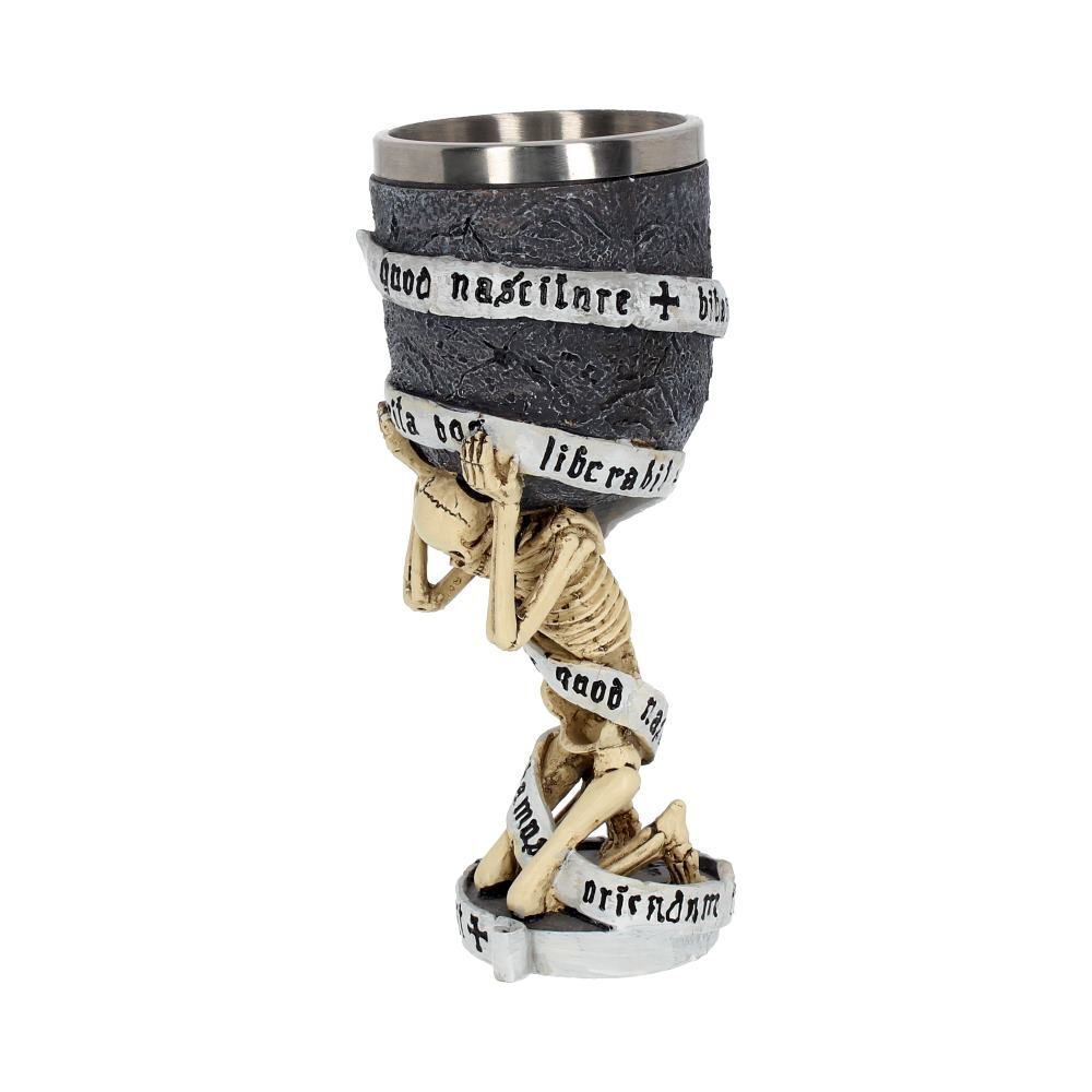 Этот кубок изготовлен из полиcтоуна со вставным стаканом из нержавеющей стали, раскрашен вручную и отполирован. Он имеет высоту 18см. Предназначен для использования по прямому назначению, а так же в декоративных целях. Мыть только вручную. Объем бокала - 200 гр. Из коллекции бренда Nemesis Now этот красиво оформленный кубок, подойдет в качестве подарка или 4 интерьера. Чаша кубка изготовлена из полистоуна и имитирует потрескавшийся камень, который лежит на плечах скелета, образующего ножку кубка. Скелет стоит на коленях на твердой земле, пригибаясь под весом каменной чаши. Вокруг кубка расположен текст на латинском языке, который гласит «Правда освободит нас». Отлитый из высококачественного полистоуна и искусно раскрашенный вручную. 18 см.