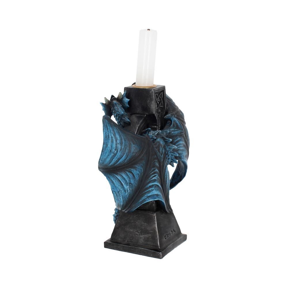 Этот подсвечник с готическим драконом появился благодаря готическому воображению всемирно известной художницы альтернативного фэнтези Анны Стоукс. Этот черный кельтский крест с кельтскими узлами и замысловатыми узорами, инкрустированными черными драгоценными камнями, - идеальное место для отдыха нашего огненного спутника. Прижавшись к спине креста, синий дракон с поднятыми крыльями и головой настороженно следит за любыми злоумышленниками или потенциальными ворами. В верхней части креста есть небольшое пространство для установки свечи. Отлитый из тончайшей смолы и тщательно раскрашенный вручную, этот предмет является фантастическим способом осветить свой путь в готических фантазиях. 18 см.