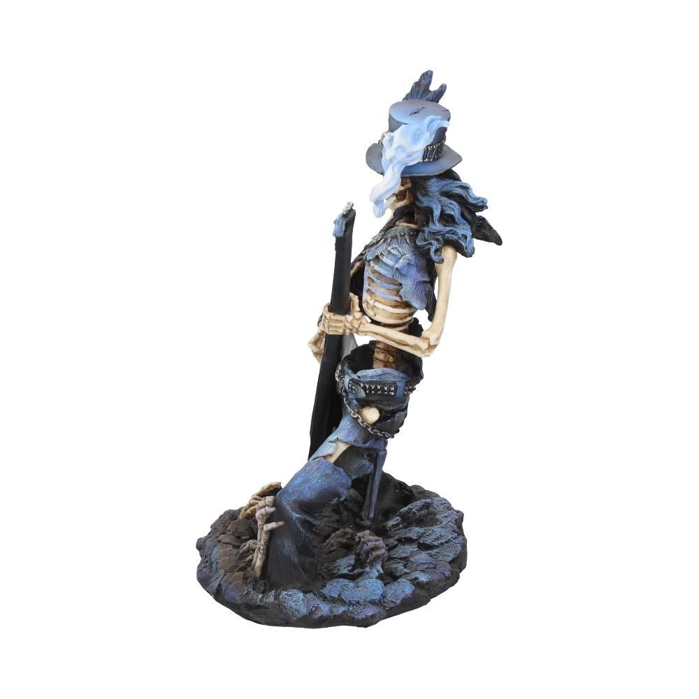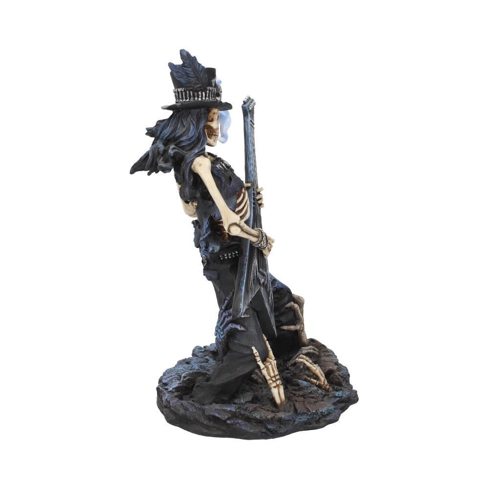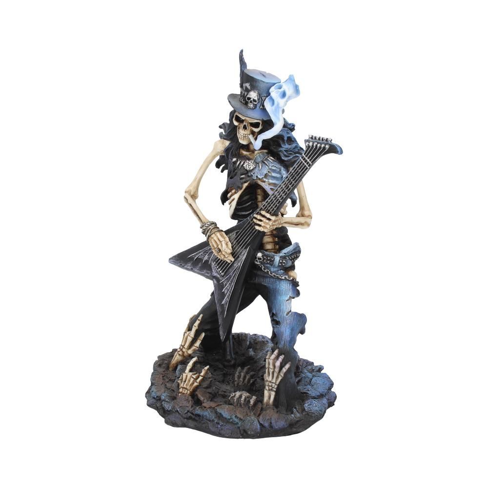 Эта хард-роковая вещь родилась из художественного произведения Джеймса Раймана, а затем была увековечена в полистоуне альтернативным брендом Nemesis Now. На туманном кладбище, освещенном луной, в обрамлении мертвых деревьев, этот скелет принимает позу, играя на черной летающей гитаре V. Руки скелетов тянутся вверх из-под земли, некоторые хватаются за ноги, другие сложили пальцы в знак рога. Длинные черные волосы струятся из-под черной шляпы, а на шляпной ленте, закрепленной серебряным черепом, висит длинное черное перо и пиковый туз. Сигаретный дым туманом вьется вверх и образует кричащий череп, подразумевая, что они курят чью-то душу. Отлитая из тончайшего полистоуна, а затем искусно раскрашенная вручную, эта фигурка заставит любого музыканта взять в руки инструмент и играть! 24 см.