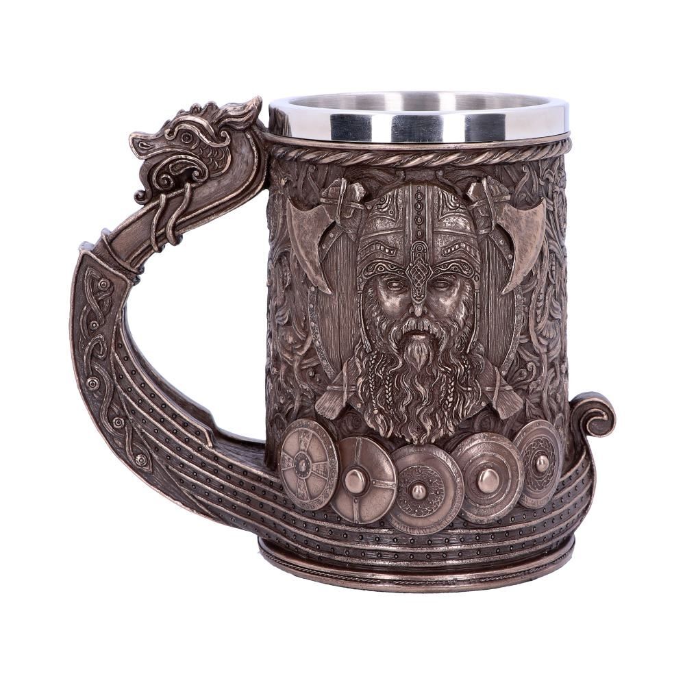 Сражайтесь за Валгаллу с бронзовым драккаром, созданным компанией Nemesis Now! Корпус этой кружки украшен замысловатой резьбой с великих кораблей викингов древности. На боковой стороне кружки изображено лицо воина в большом шлеме с двумя грозными топорами, скрещенными за спиной. Ниже портрета изображен квартет щитов викингов, опирающихся на корпус корабля. Ручка сделана из носовой части большого боевого корабля викингов и украшена резной головой дракона, которая образует верхнюю часть ручки. Отлитый из высококачественной бронзы, этот танкард поставляется со съемной вставкой из нержавеющей стали для удобства чистки.