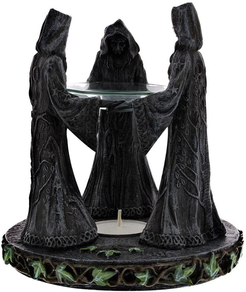 Из коллекции сувенирной продукции фэнтезийного бренда Nemesis Now эта масляная лампа Матерь, Дева и Старица станет идеальным центральным элементом любого алтаря. Иллюстрируя этапы жизни, здесь стоят юная дева, женщина и пожилая дама, все они держат стеклянную тарелку, в которой можно нагревать масло. Каждая из них одета в мантию с капюшоном, на котором выгравированы замысловатые сети корней. Основание образовано из круглого цоколя, края которого покрыты сетями плюща. На спине у каждой женщины изображена соответствующая фаза луны - полумесяц или полнолуние.