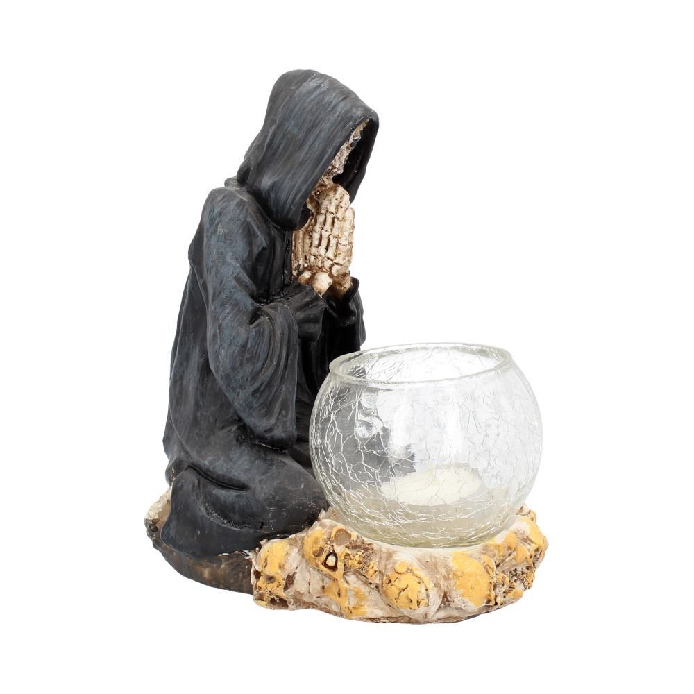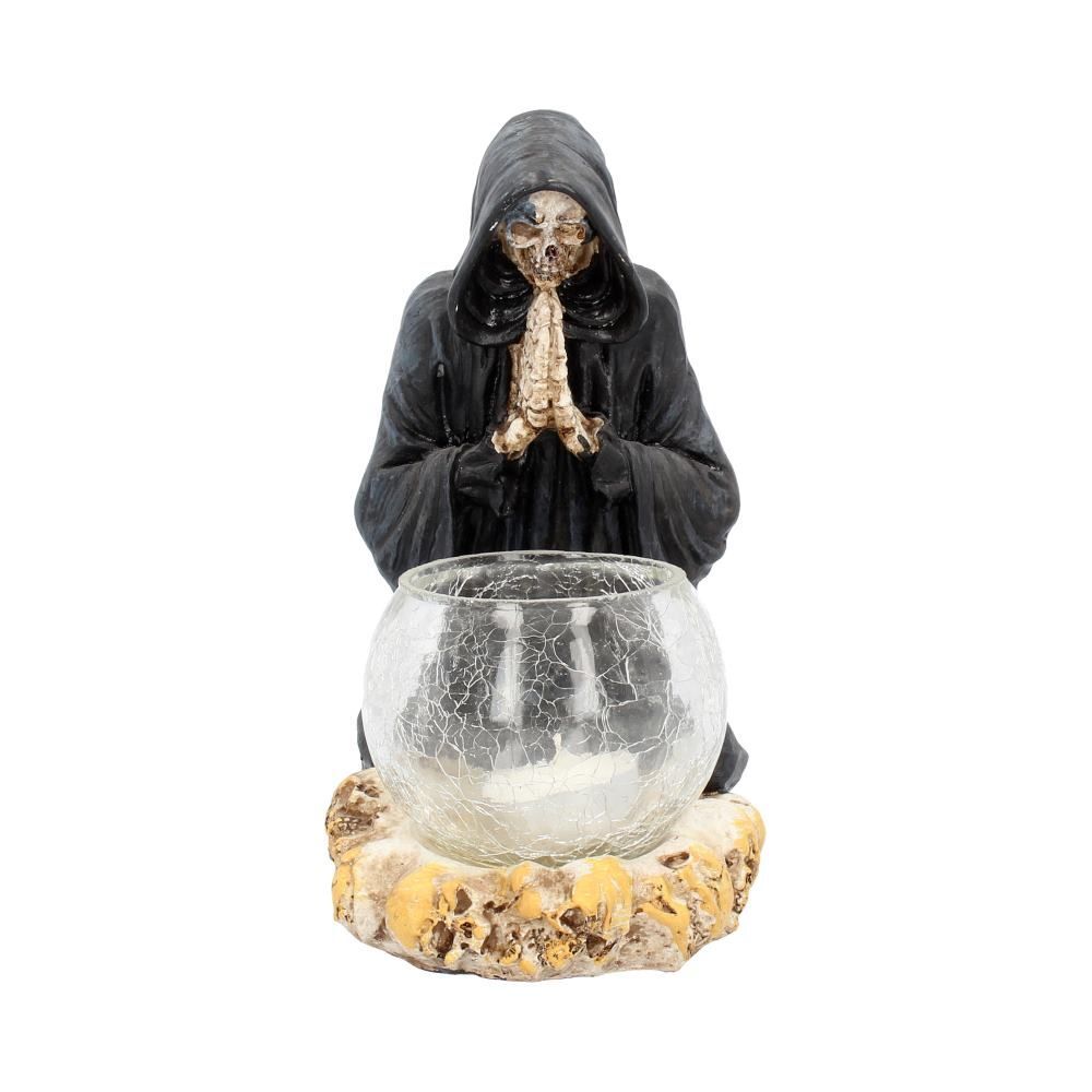 Грозный Жнец сложил руки в молитве, взывая к силе выше себя. Перед ним стоит большая надтреснутая стеклянная сфера, находящаяся на вершине груды черепов. Возможно, это место отдыха для всех душ, которые он забрал, и теперь он молится, чтобы они шли дальше в своем путешествии в загробную жизнь. Отлитый из высококачественной смолы, а затем искусно расписанный вручную, эта предмет станет желанным дополнением к любому готическому интерьеру. 19 см.