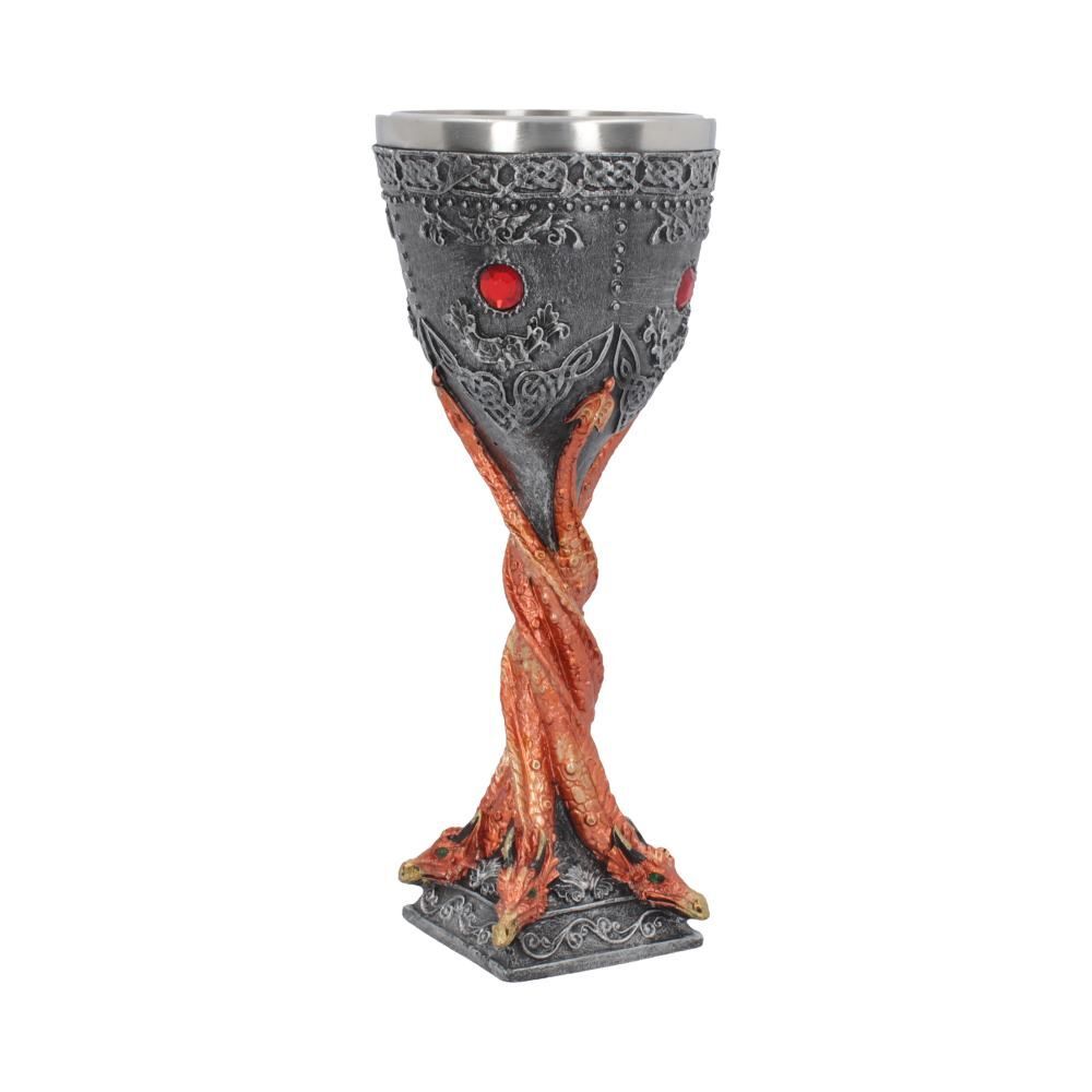 Этот кубок был создан талантливыми дизайнерами бренда Nemesis Now. Отлитый из тончайшего полистоуна, а затем тщательно расписанный вручную, этот кубок поставляется со съемной вставкой из нержавеющей стали для удобства очистки. Предназначен для использования по прямому назначению, а так же в декоративных целях. Мыть только вручную. Объем бокала - 200 мл. Этот готический кубок идеально подходит для любого поклонника фэнтези. Основное внимание уделяется ножке, на которой расположены извивающиеся тела четырех янтарных драконов. Их головы лежат на каждом углу квадратного основания, которое украшено замысловатыми узорами из виноградных лоз. Несмотря на относительно простой дизайн, чаша украшена кельтскими узорами и четырьмя красными драгоценными камнями рубинового цвета. 24 см.