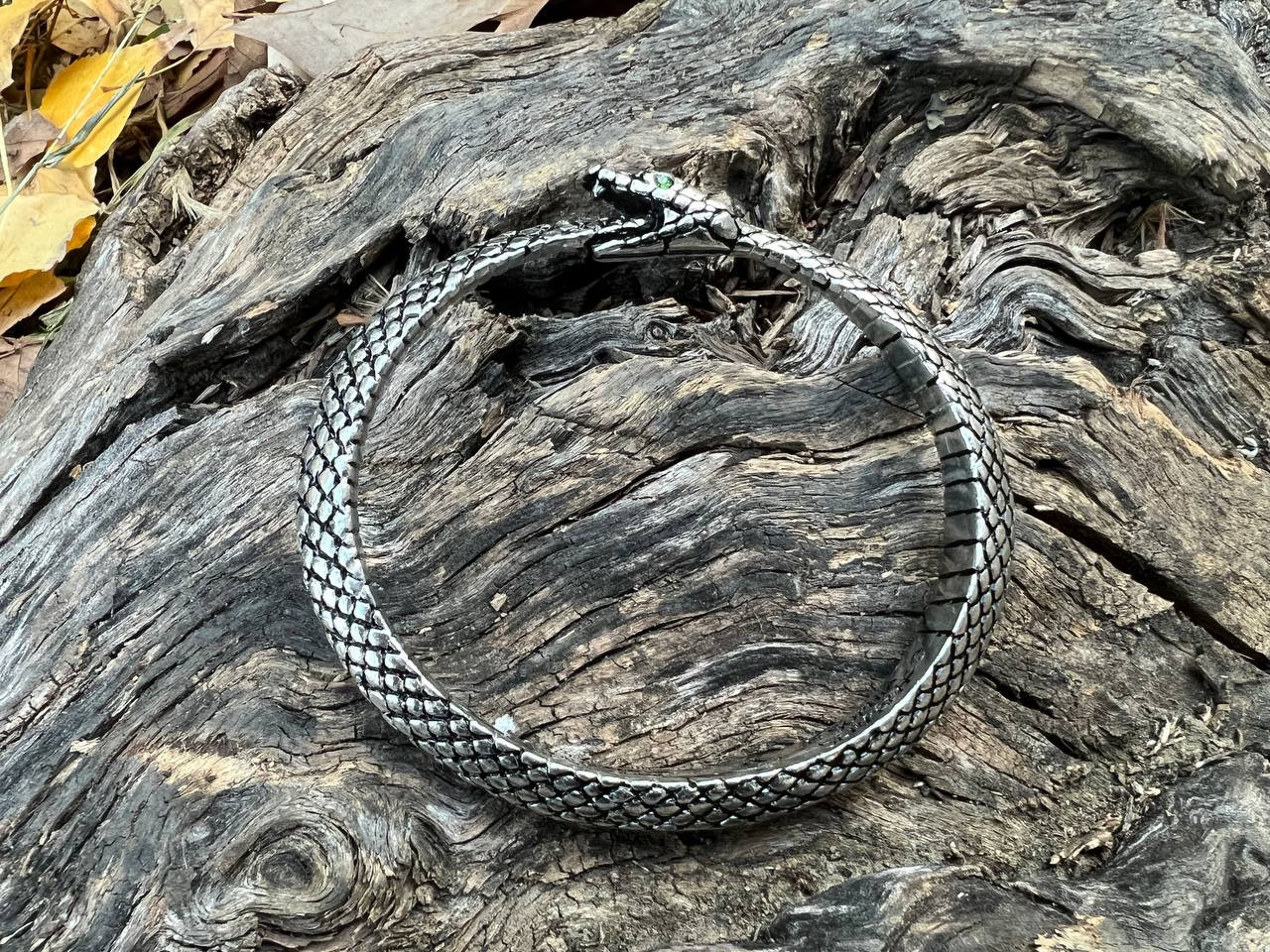 Браслет изображает Уроборос — змею, поедающую свой хвост, что символизирует циклы жизни, смерть и возрождение. Наличие зеленых австрийских кристаллов в глазах змеи добавляет изящество и яркость, делая изделие более привлекательным и уникальным.
