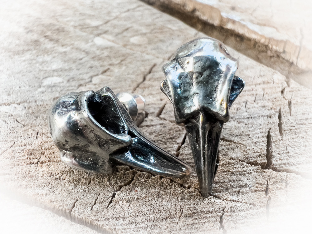 Скандинвский - "череп ворона"; великие черные птицы славятся своими пророческими способностями, являясь посланниками Одина и способные предсказывать смерть. Сговор воронов всегда привлечет внимание на хорошо заметном месте. Пара аутентичных миниатюрных черепов воронов в полированном английском пьютере,
