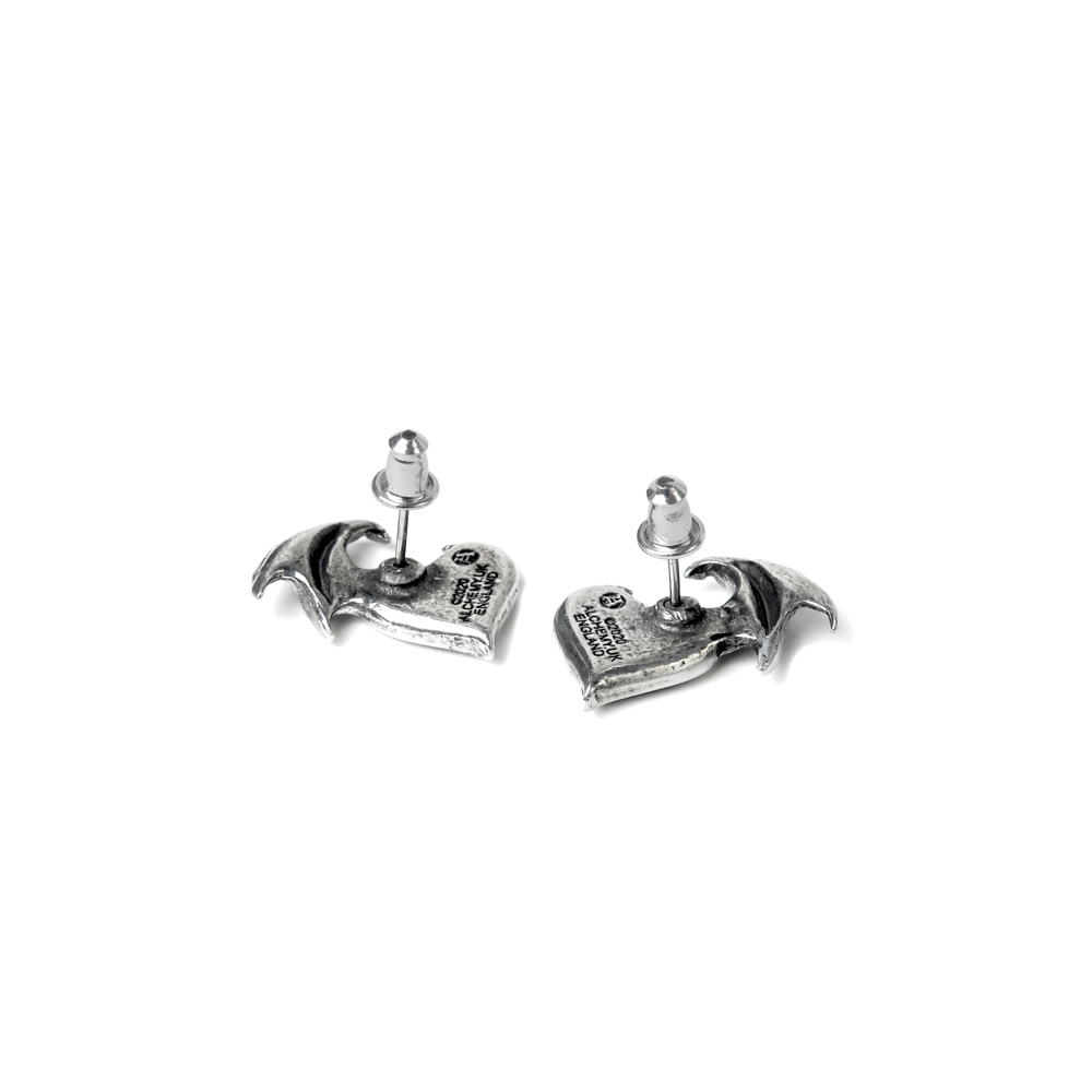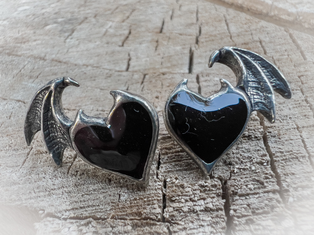 Черное сердце готической прелестницы-демоницы, заманивающей свою добычу в ночи магическим очарованием. Миниатюрная пара серёг-сердечек с крыльями летучей мыши. Вес и размеры: H: 20 мм (0,79 дюйма) W: 21 мм (0,83 дюйма) D: 15 мм (0,59 дюйма) Вес: 6 г (0,21 унция).